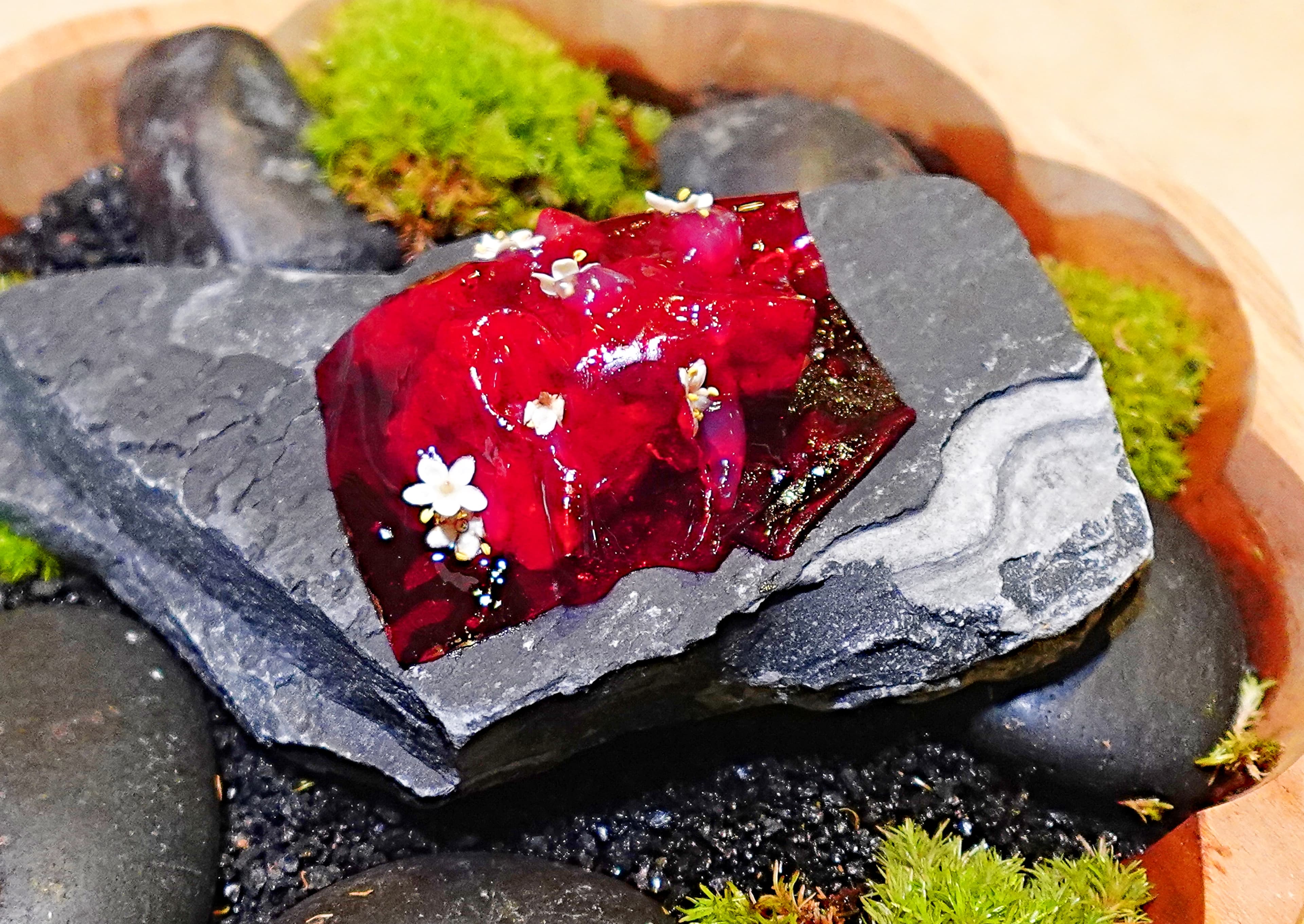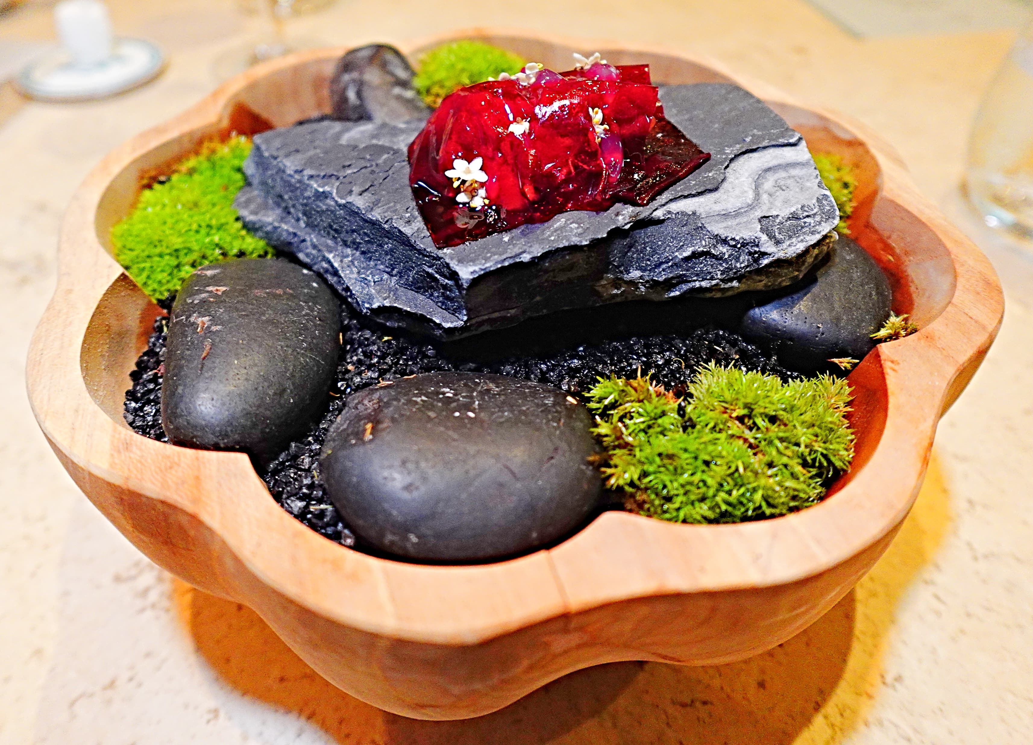 - Duck Dumpling, Chicken Liver, Beetroot Gelee