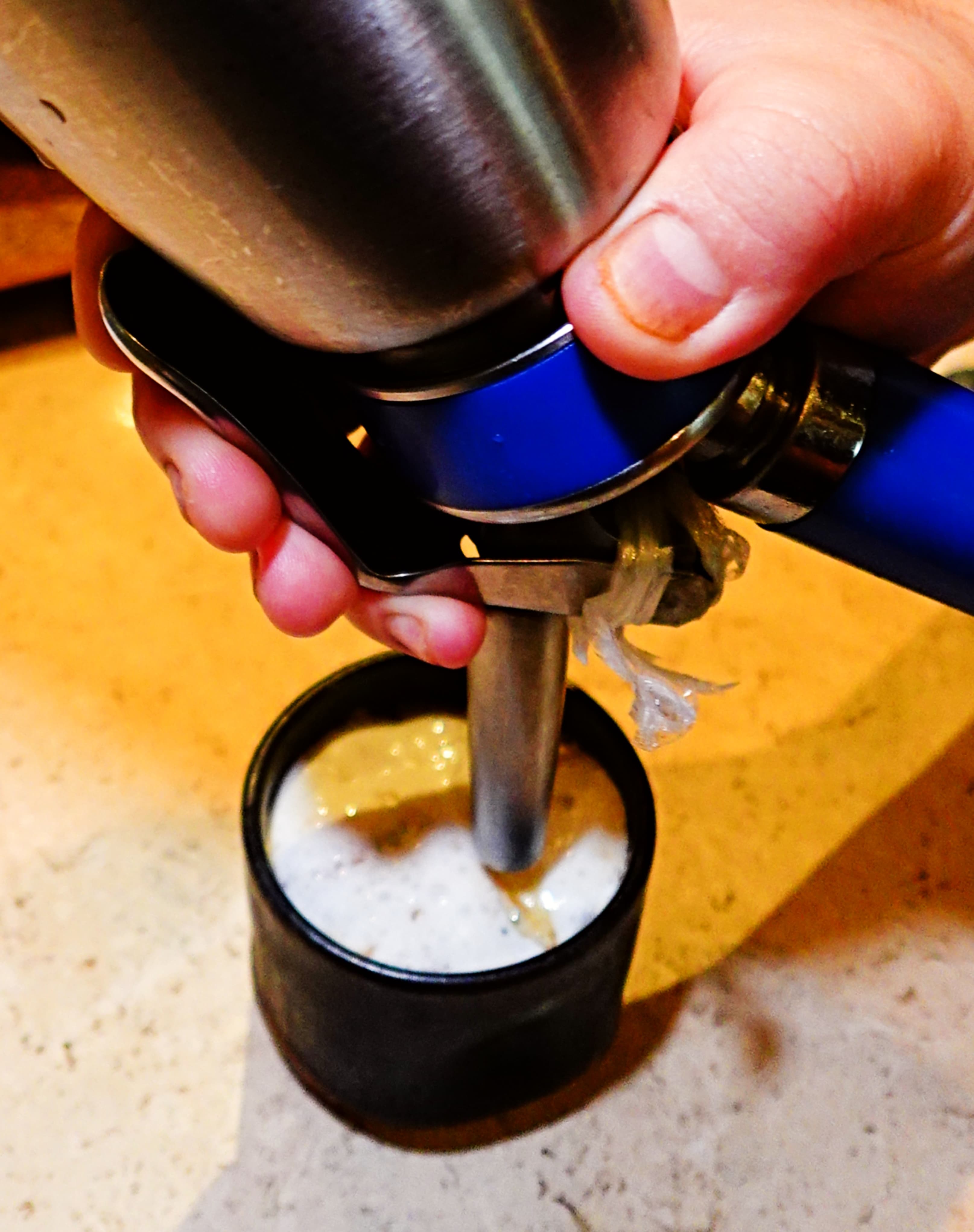 Pouring in the tomato concentrate, made from sieving and freezing fresh tomatoes.