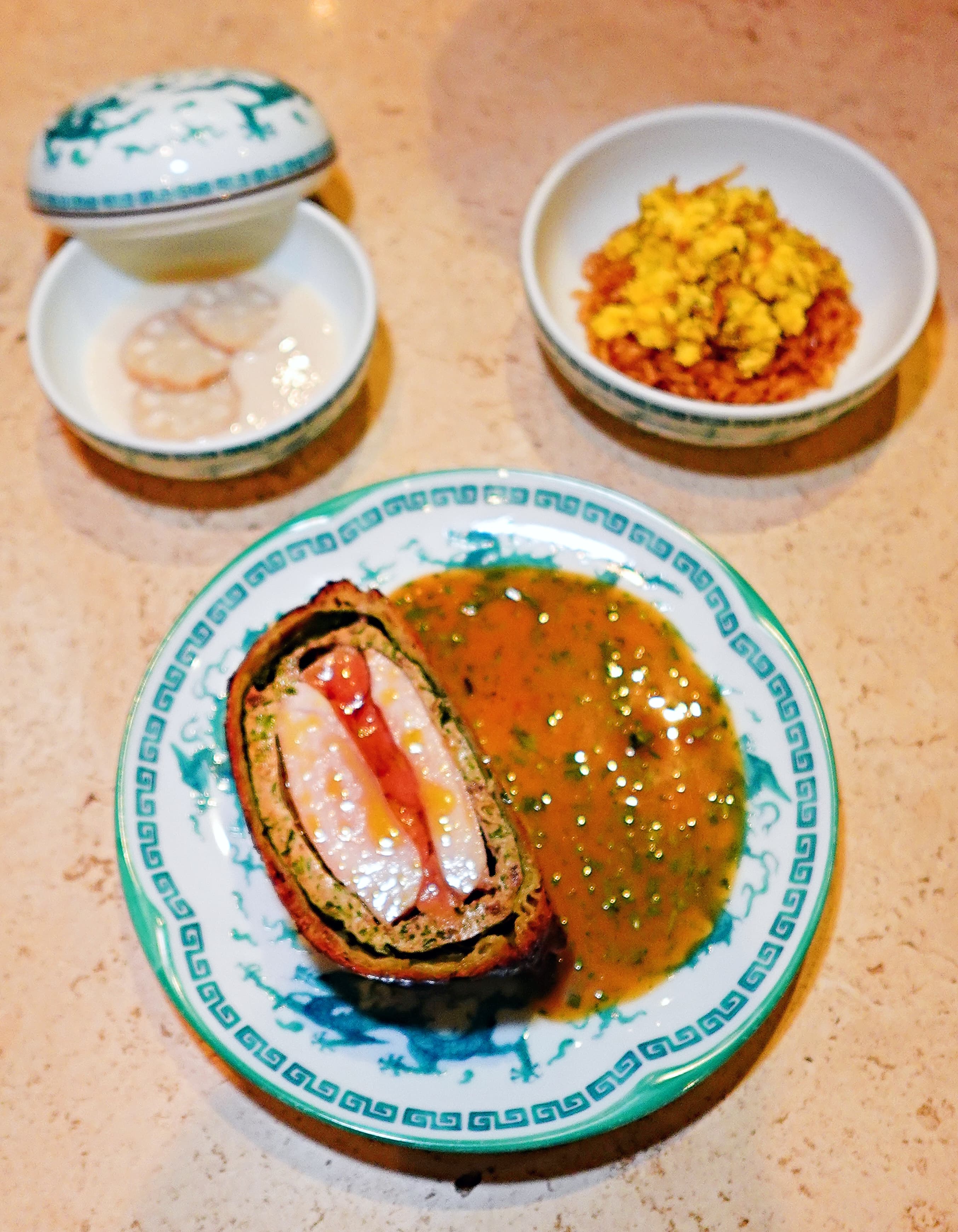- Chōwa Chicken Pithivier, Soy Fried Rice with Threadfin Roe, Pickled Lotus Root, Spiced Bone Broth.