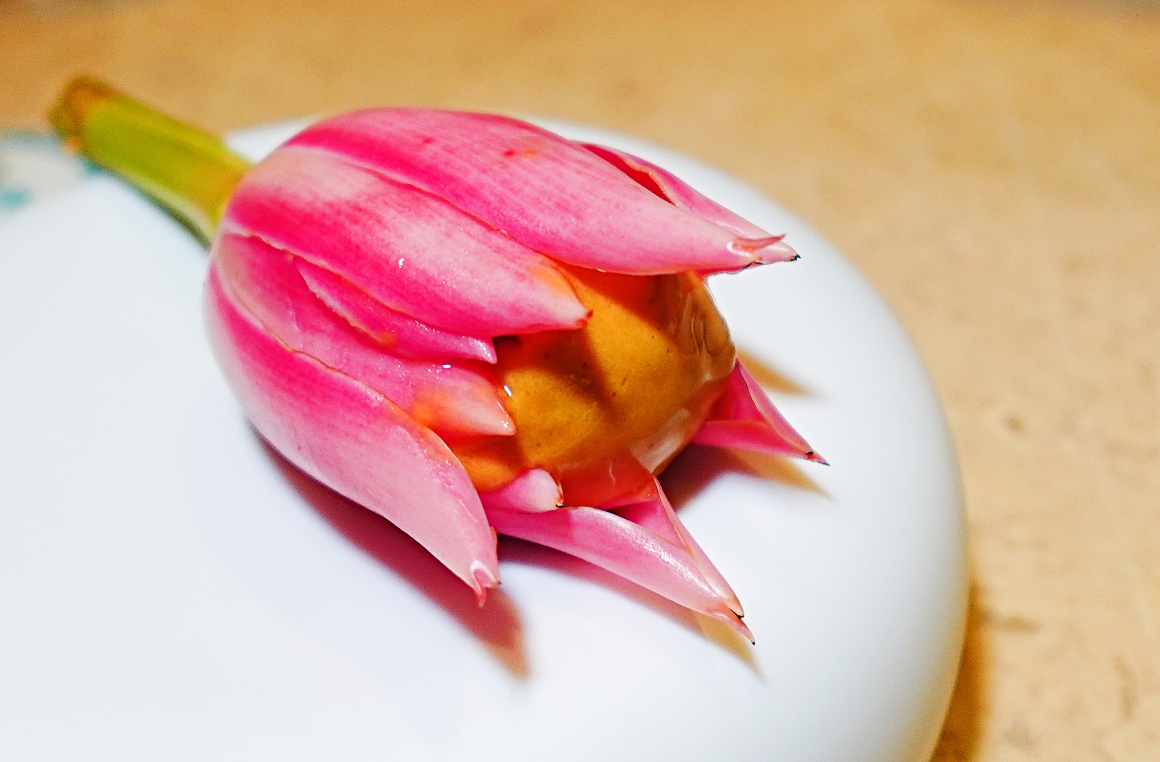 Ginger flower sorbet, contained within a fresh ginger flower bloom.