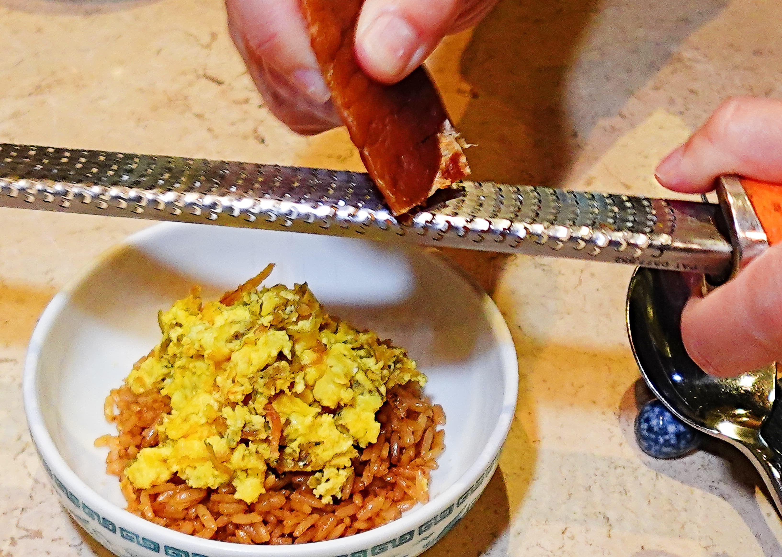 Shaving dried Threadfin Roe onto the Soy Fried Rice, topped with Silverfish.