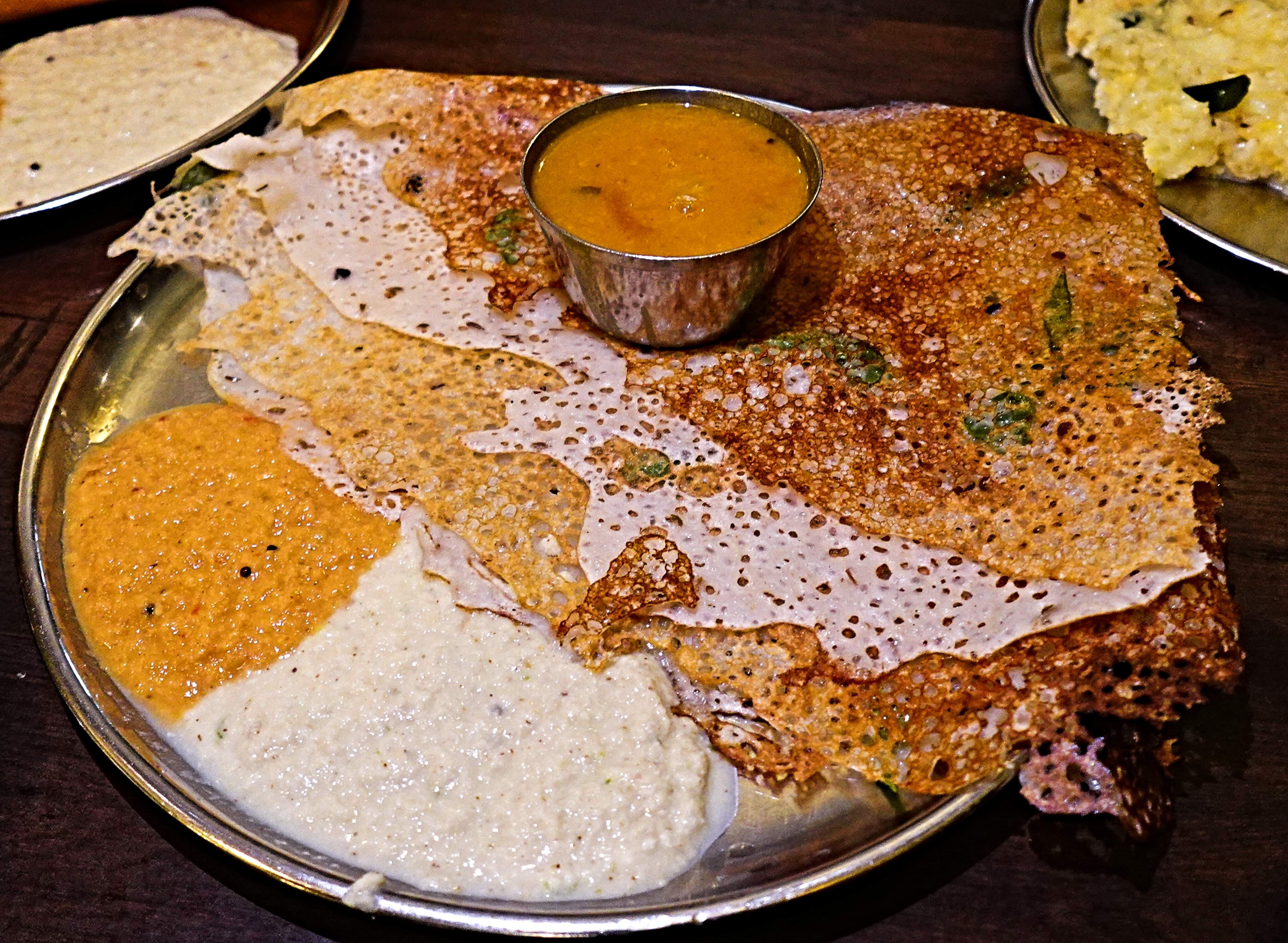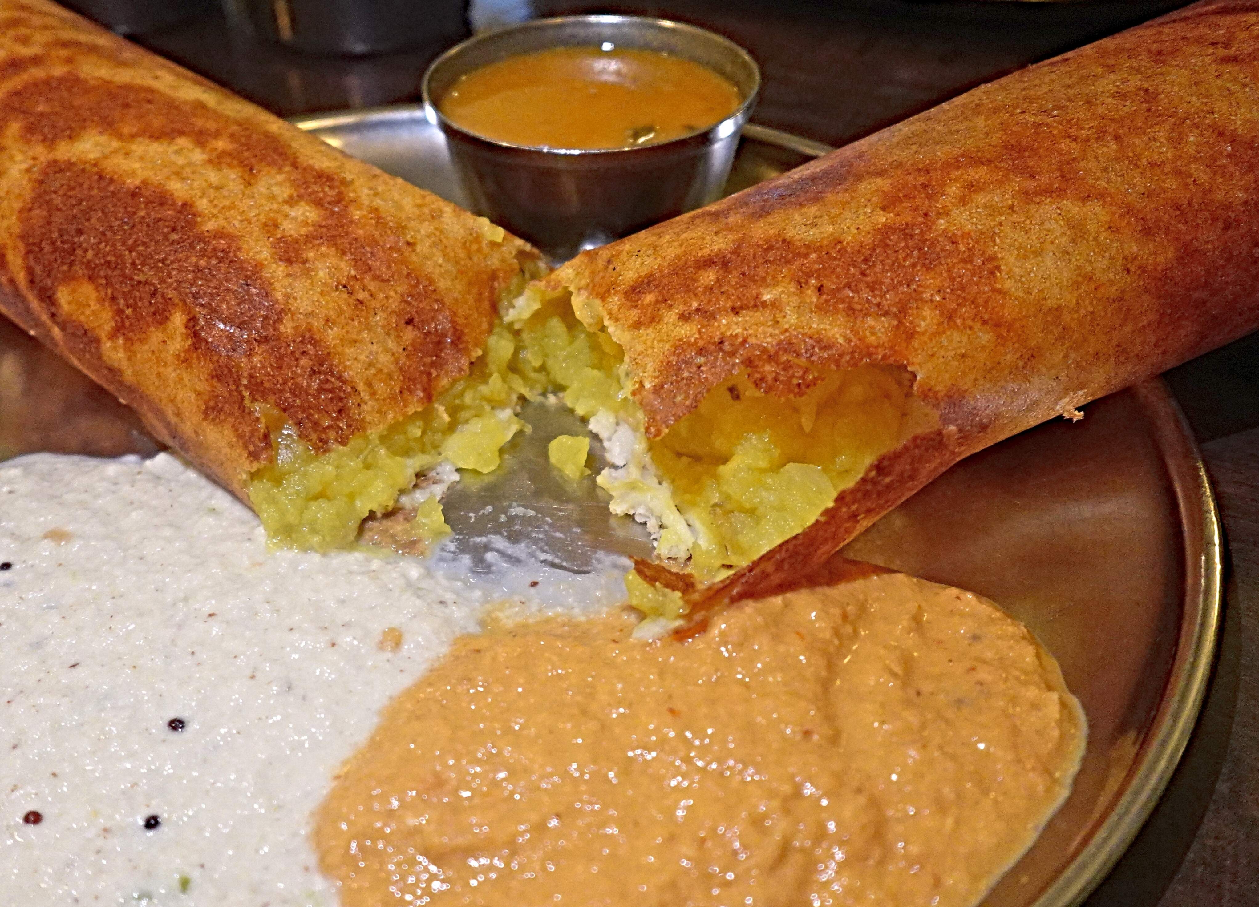 Utterly scrumptious on its own, but elevated to ethereal levels when anointed with the creamy chutneys and lightly-spiced sambhar are added.