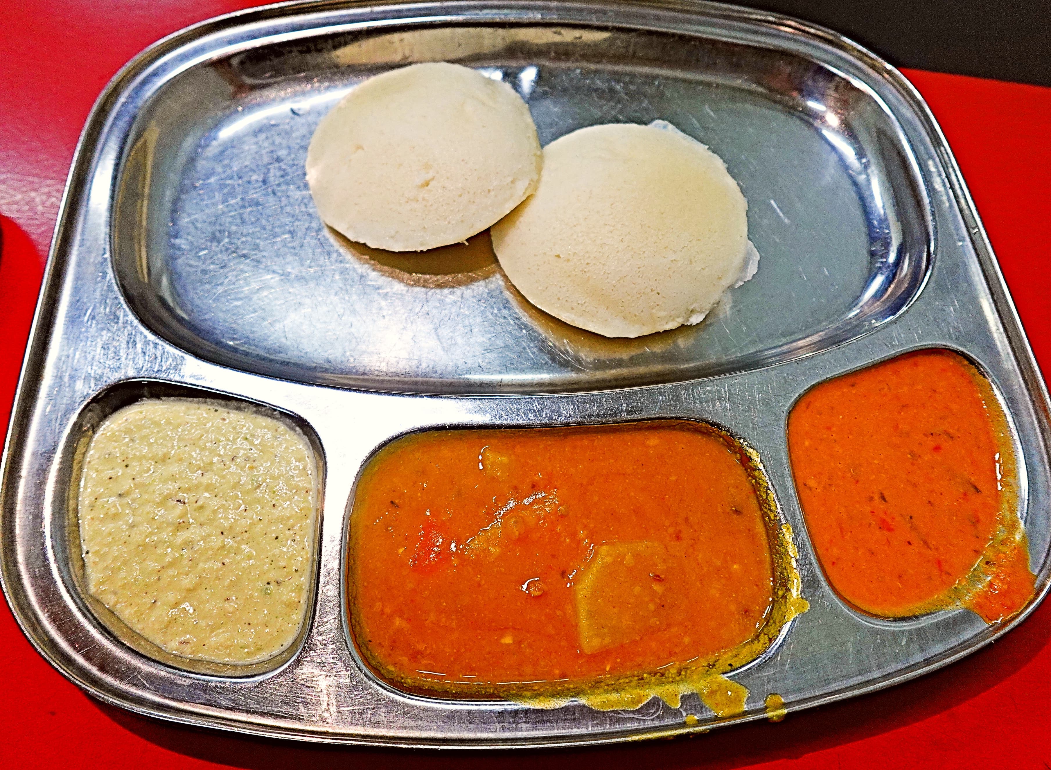 The idlis were accompanied by coconut chutney, and some very red-hot chili-spicy sambhar.