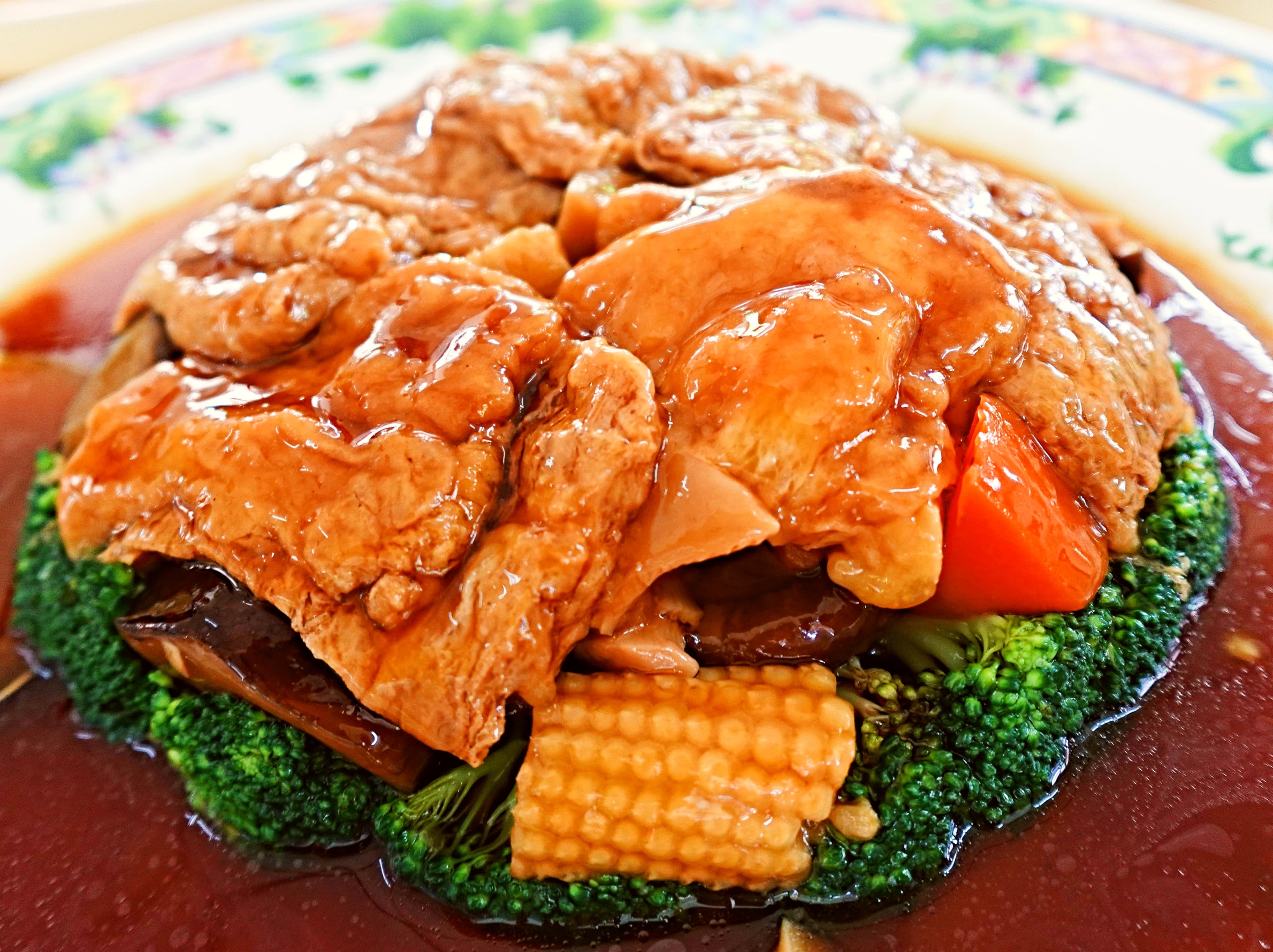 Braised broccoli, baby corn, shitake mushrooms, carrot and tofu skin.