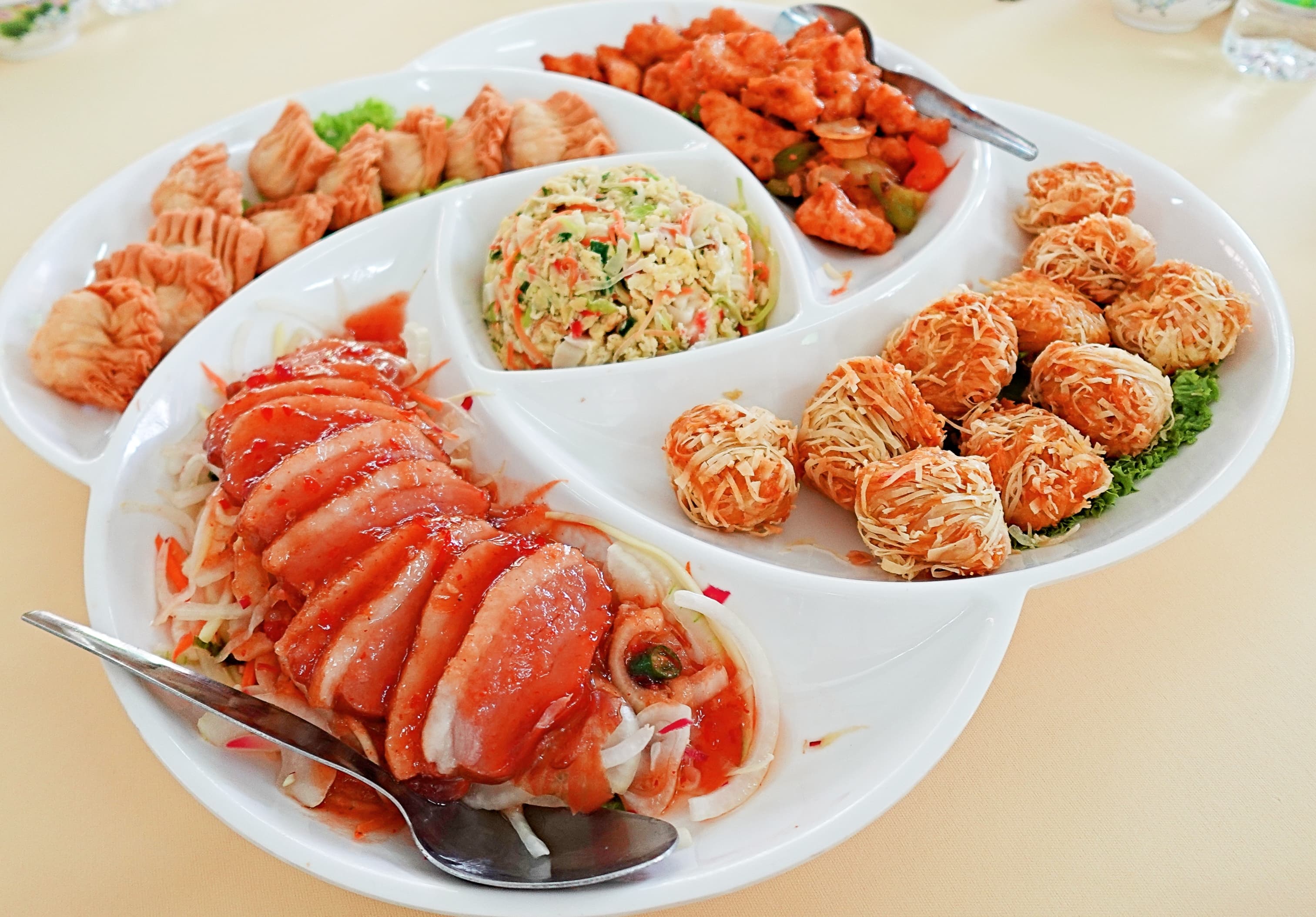 Appetiser platter: crisp-fried pork dumplings, seafood omelette, spicy-sour batter-fried fish fillets, golden-fried chicken nuggets, spicy-sweet-sour ham.