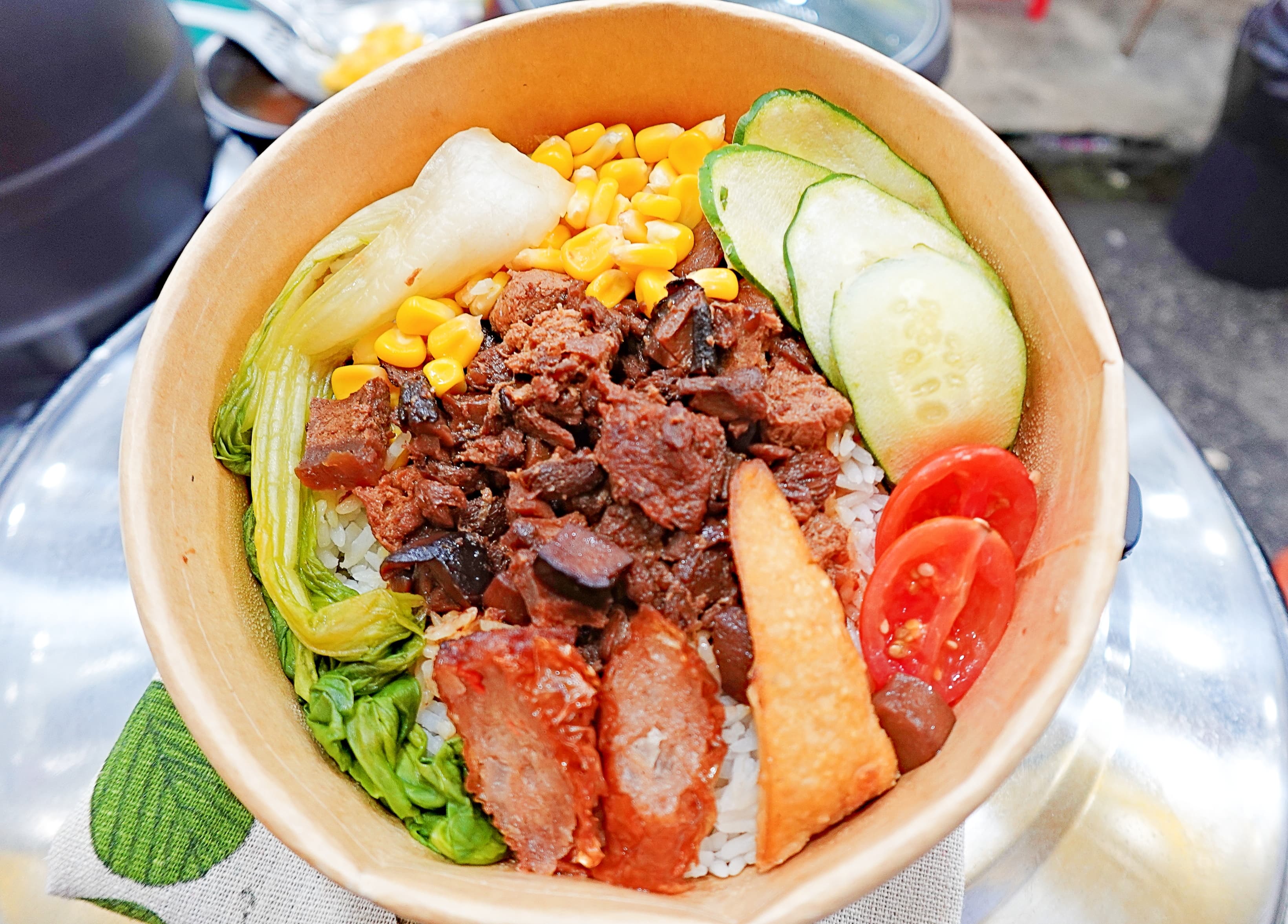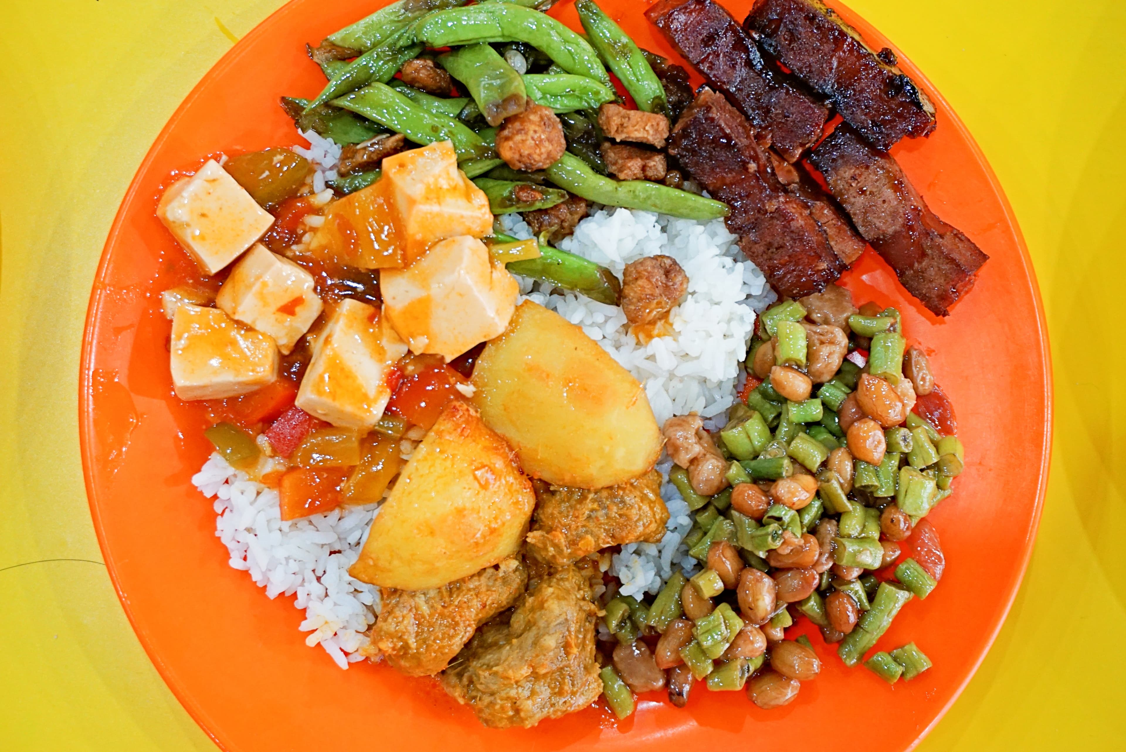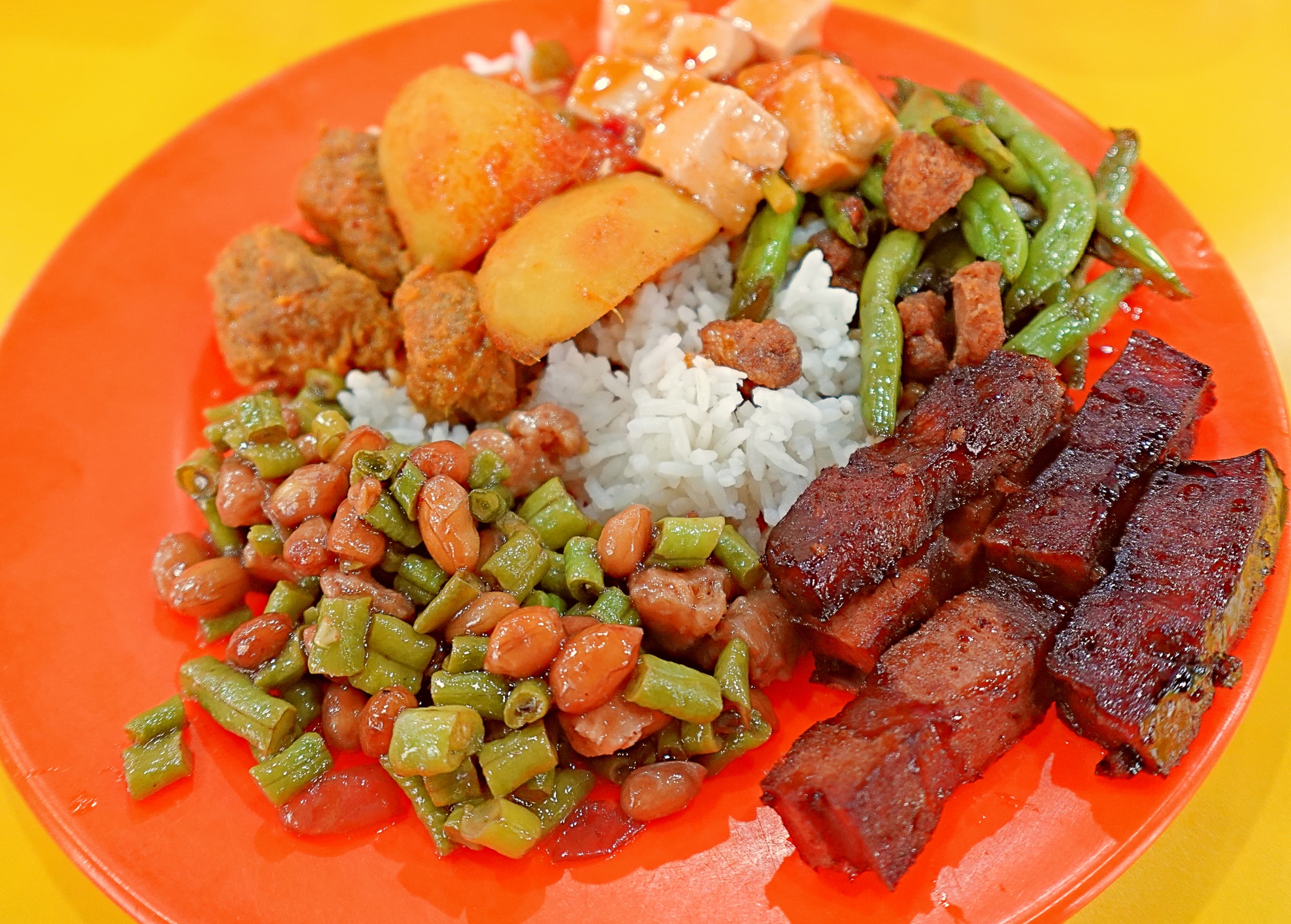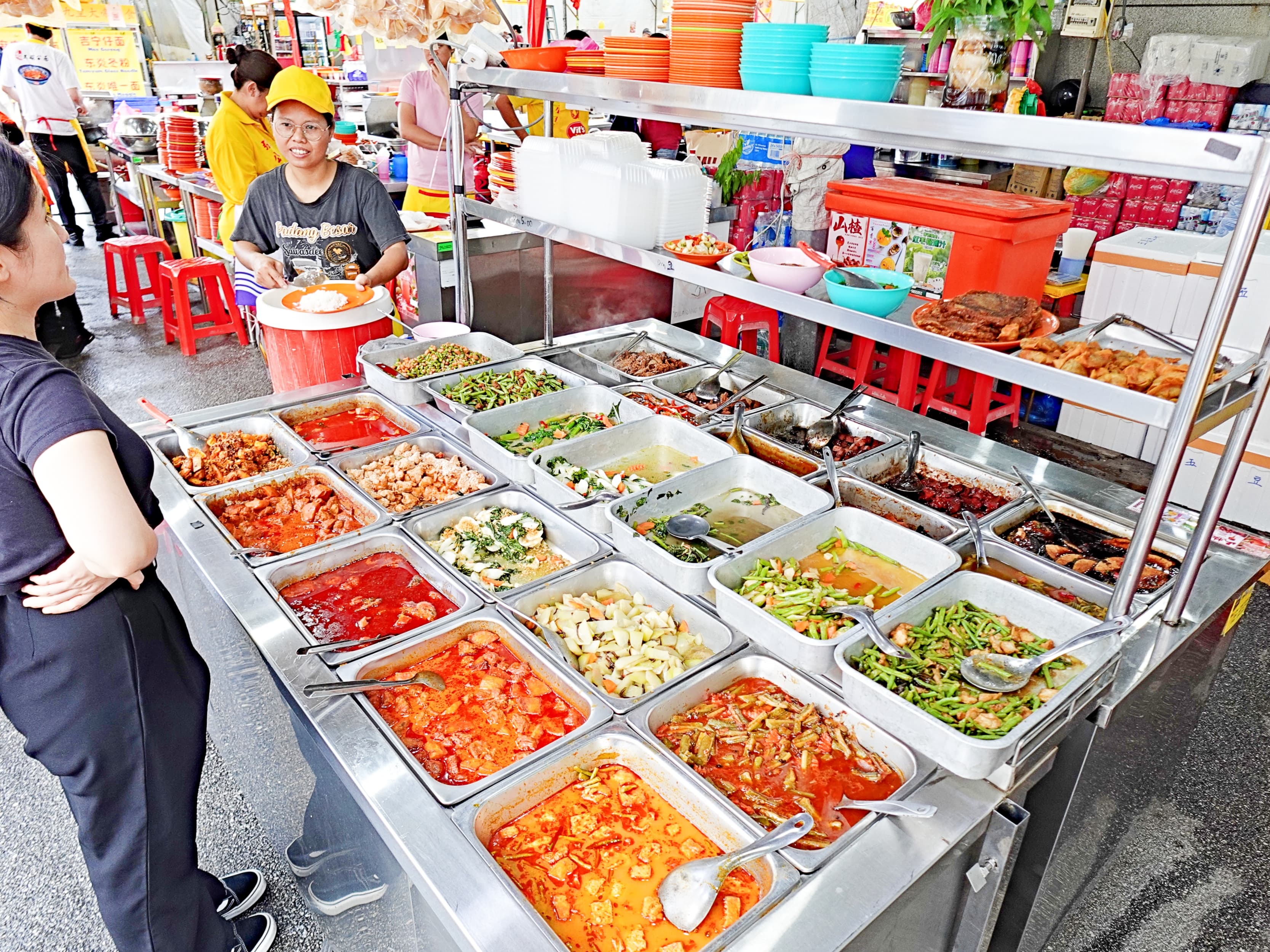 - Rice with vegetarian sides. - one of the most popular options from the rice-loving Hokkiens/Fujianese who make up 90% of the people here. One gets a plate of steamed which rice from a server, then selects one’s choice of side-dishes from a large serving counter here, buffet-style. One then goes to the cashier to get one’s plate dinner tallied. Choices are eye-popping.