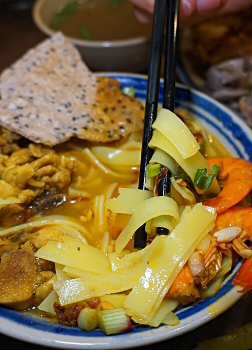𝗠𝗶 𝗤𝘂𝗮𝗻𝗴 - flat rice noodles with chicken, shrimps, sesame-studded rice crisps and quail’s eggs. There is a popular saying in Đà Nẵng, “Don’t marry a Đà Nẵng girl if you don’t like to eat Mì Quảng, and you are not a true Đà Nẵng girl if you can’t cook Mì Quảng”. The noodle dish (pronounced “Me Wang”) is a Central Vietnam specialty.