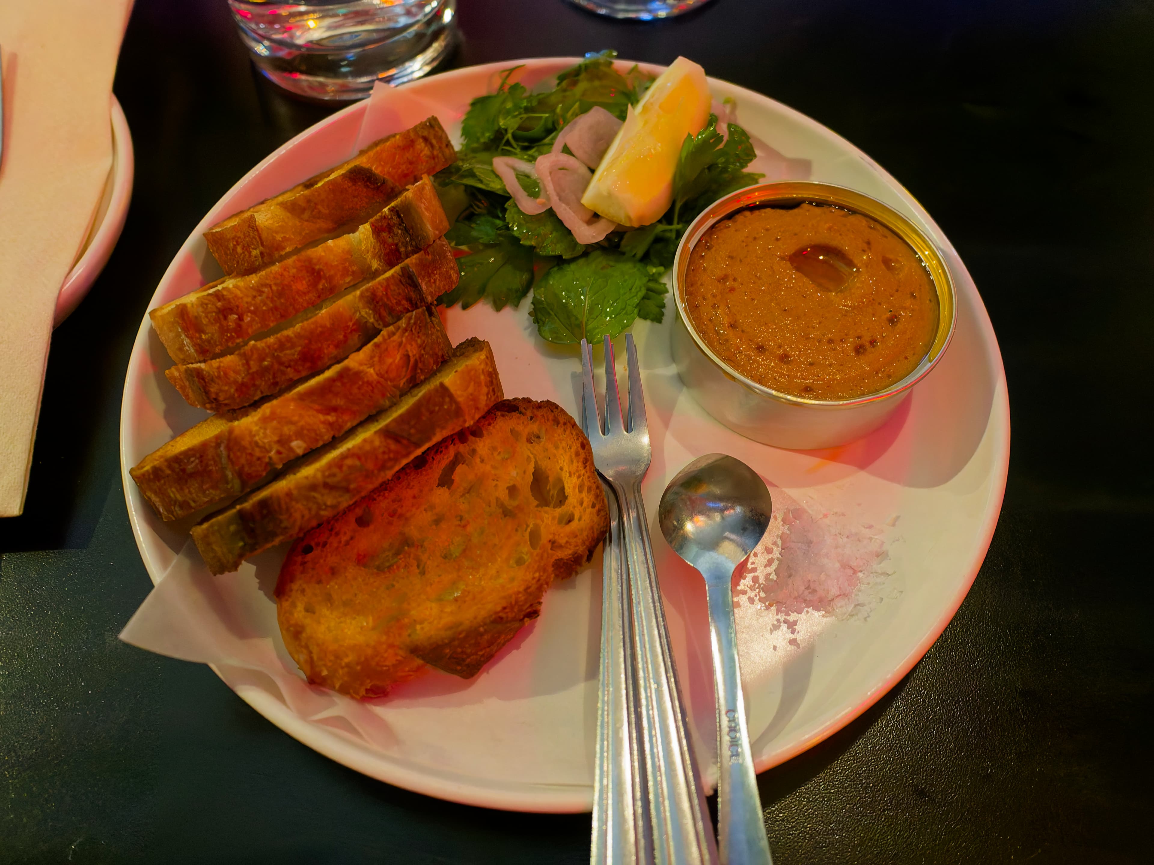 They have a selection of tinned fish and seafood. My first choice - the Mackerel Pate - had run out, so instead I had the Mussels in Pickled Sauce ($22), which was good. There was a tin full of mussels in a slightly vinegary escabeche, and a number of crunchy toasted bread rounds. There was also a small salad of pickled shallots, dill, and I think parsley.