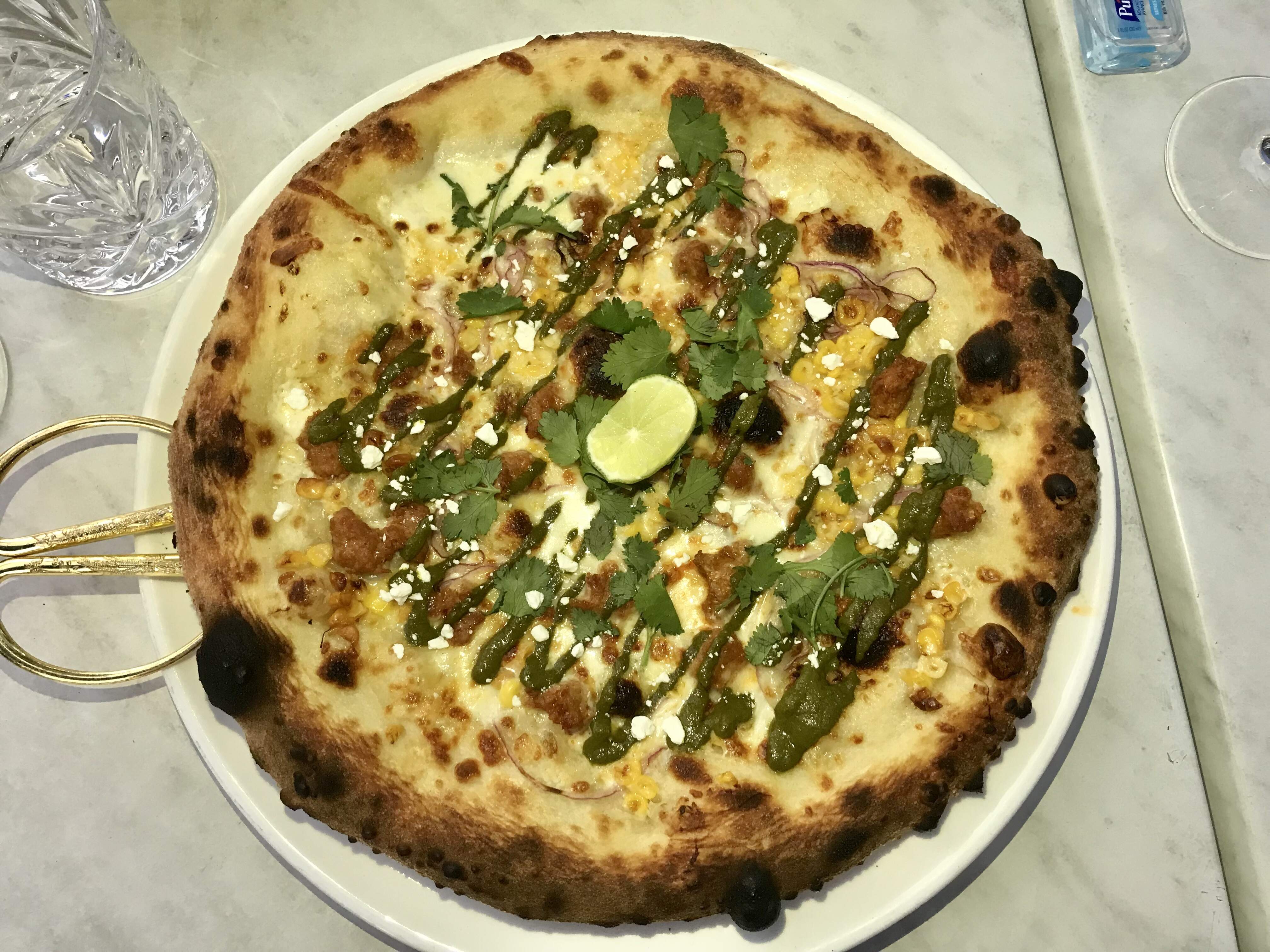 Next we had a pizza special: Corn On the Hog, a Mexican-ish riff with roasted Ontario corn, chorizo, red onion, jalapeño, lime salsa verde, fresh coriander, cotija, and a lime wedge for squeezing on. The pizza crust remains great - nice chew, good flavour. But the pizza itself, aside from the tangy salsa verde, was a bit on the bland side.