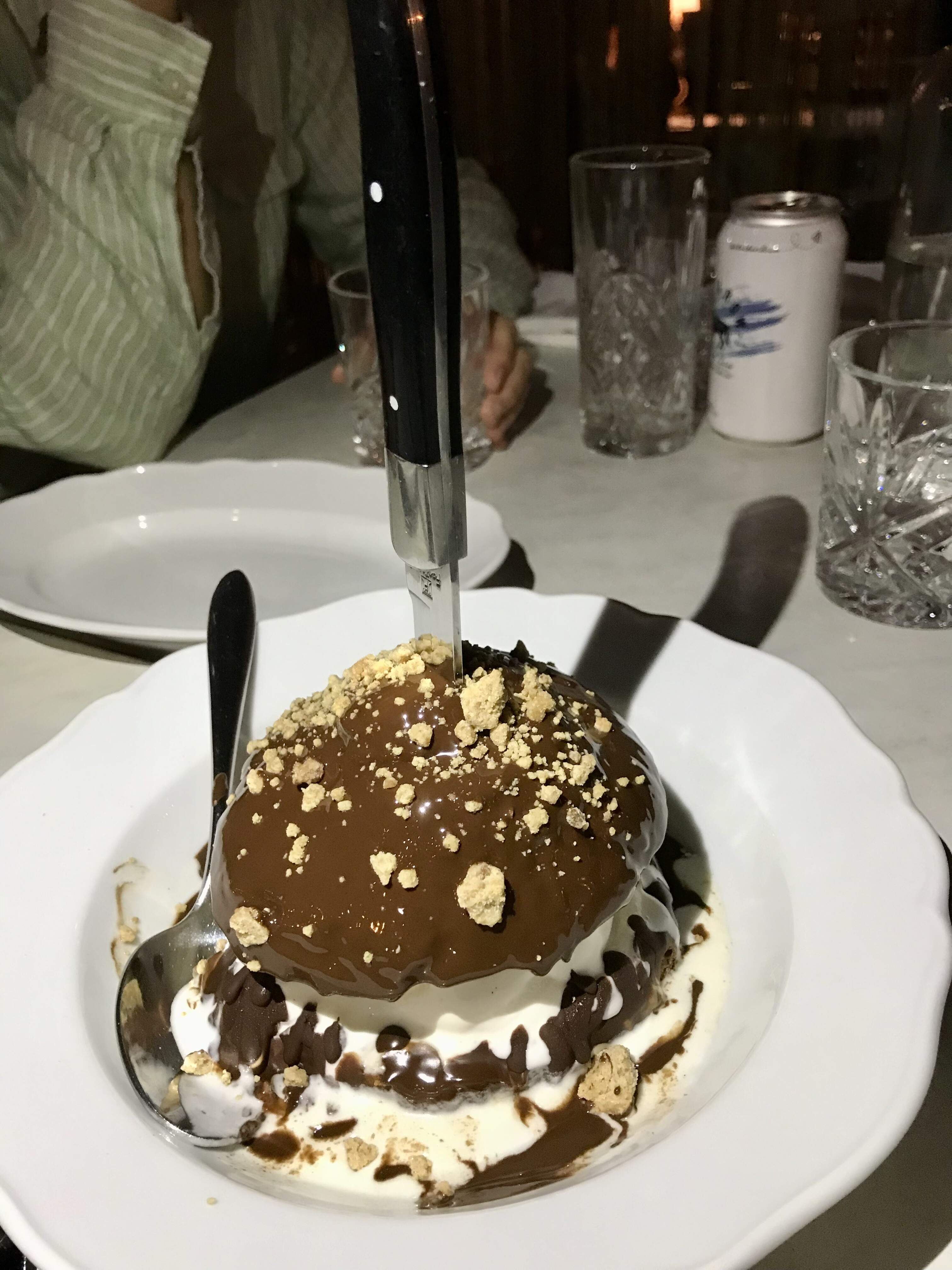 For dessert, we shared the Colossal Cream Puff, which was filled with soft-serve ice cream and drizzled with brown butter chocolate sauce, and hazelnuts. It was fun, if not spectacular.