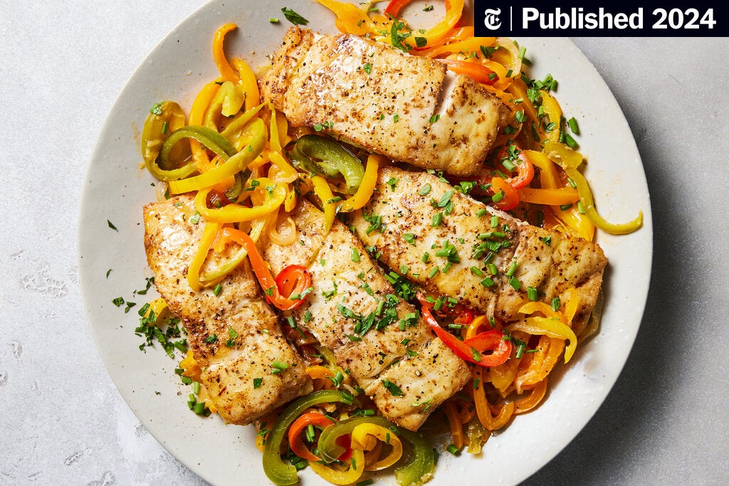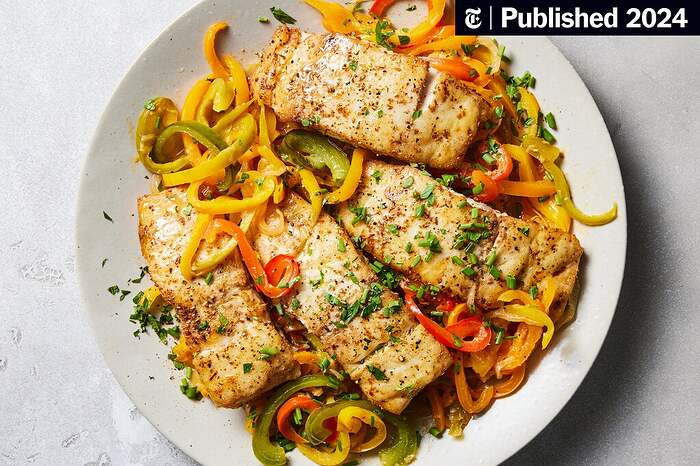 Peppers are definitely the star of the show here. I used four bell peppers and a mix of other stuff from the garden - four or five jalapenos, a few “sweet heat” peppers, and a couple of scotch bonnets (which are not coming in very hot this year, so no problem there). Slow cooked in oil with some onion, they get super sweet and are a great combination with the fish.