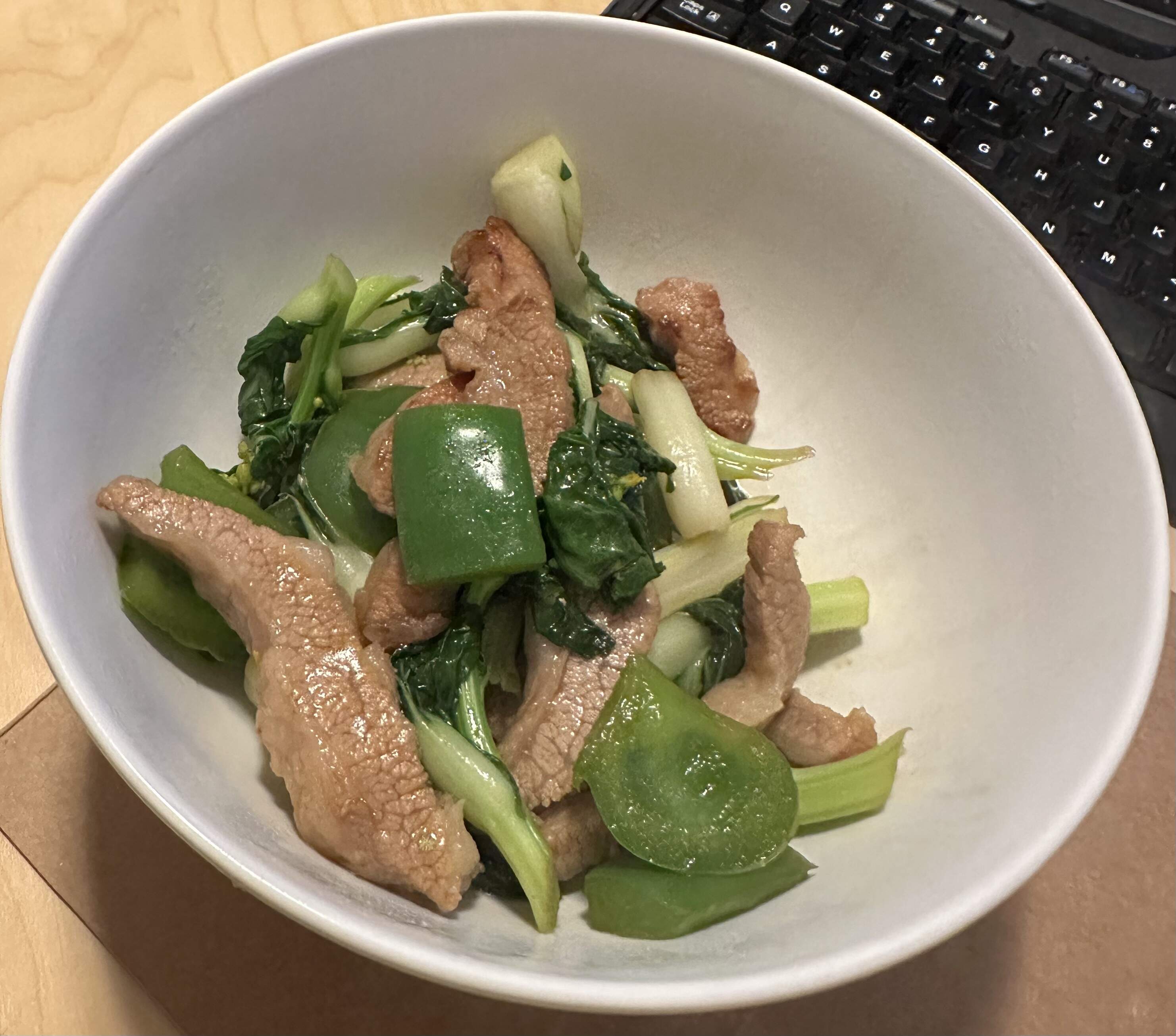 Quick half hour simple marinade with soy sauce and black pepper. Stir fried with some veggies on hand.