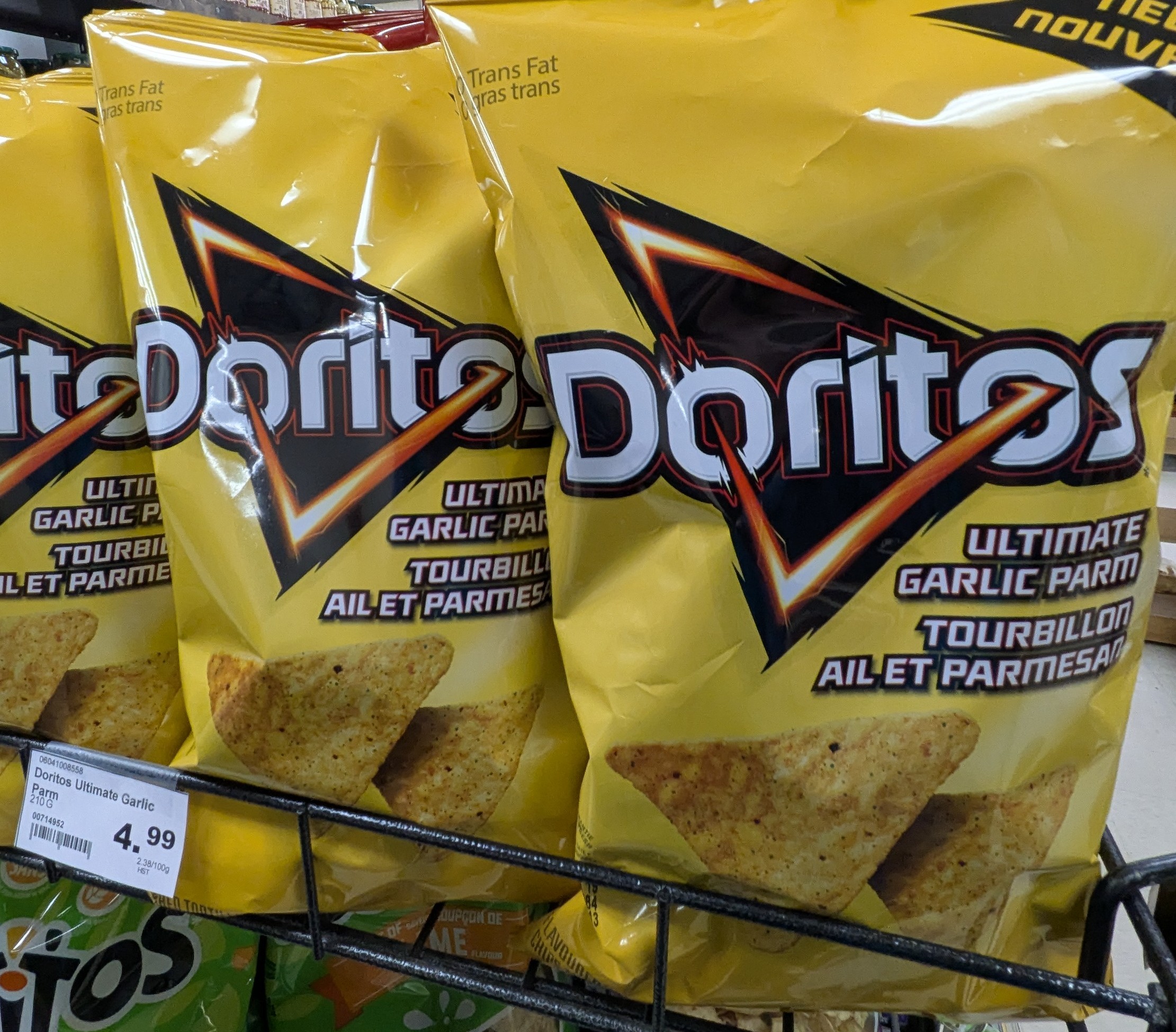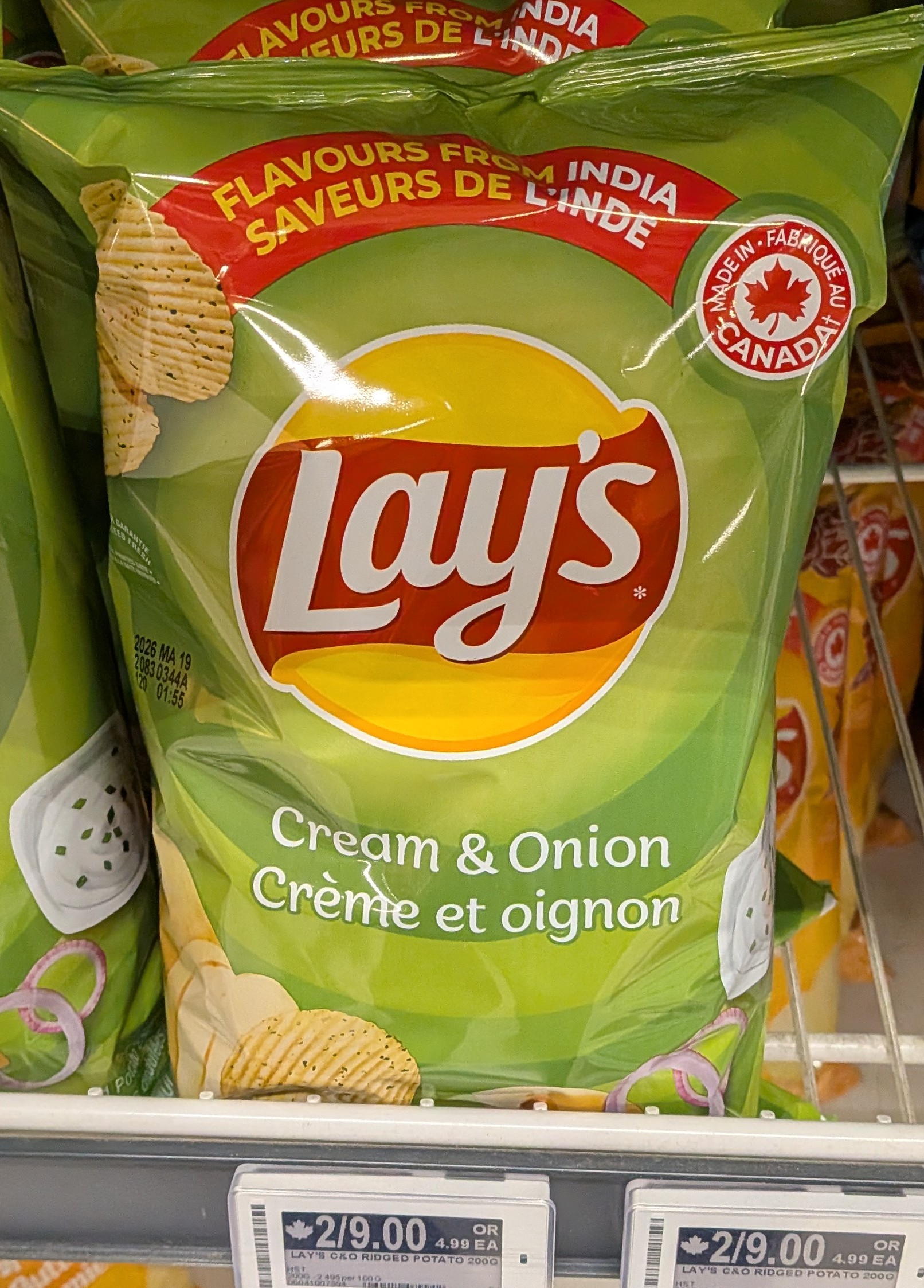 Lay’s Sour Cream and Onion is common here in Canada, too. Regular Sour Cream and Onion chips were located a few chip flavours over from the Lay’s Cream and Onion. If I see a smaller bag of Lay’s Cream and Onion, I’ll let you know how it compares to regular Lay’s Sour Cream and Onion.