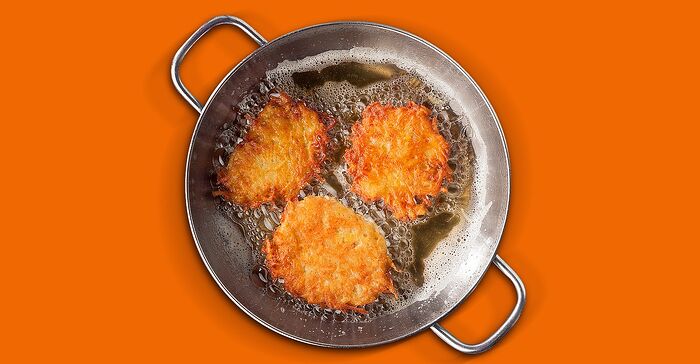 For me a course grated blend of simple Idaho and sweets, Spanish onion, eggs, matzo meal, salt & pepper. Into a 350 pan of canola and vegetable oil, nice and crisp…plain and simple…