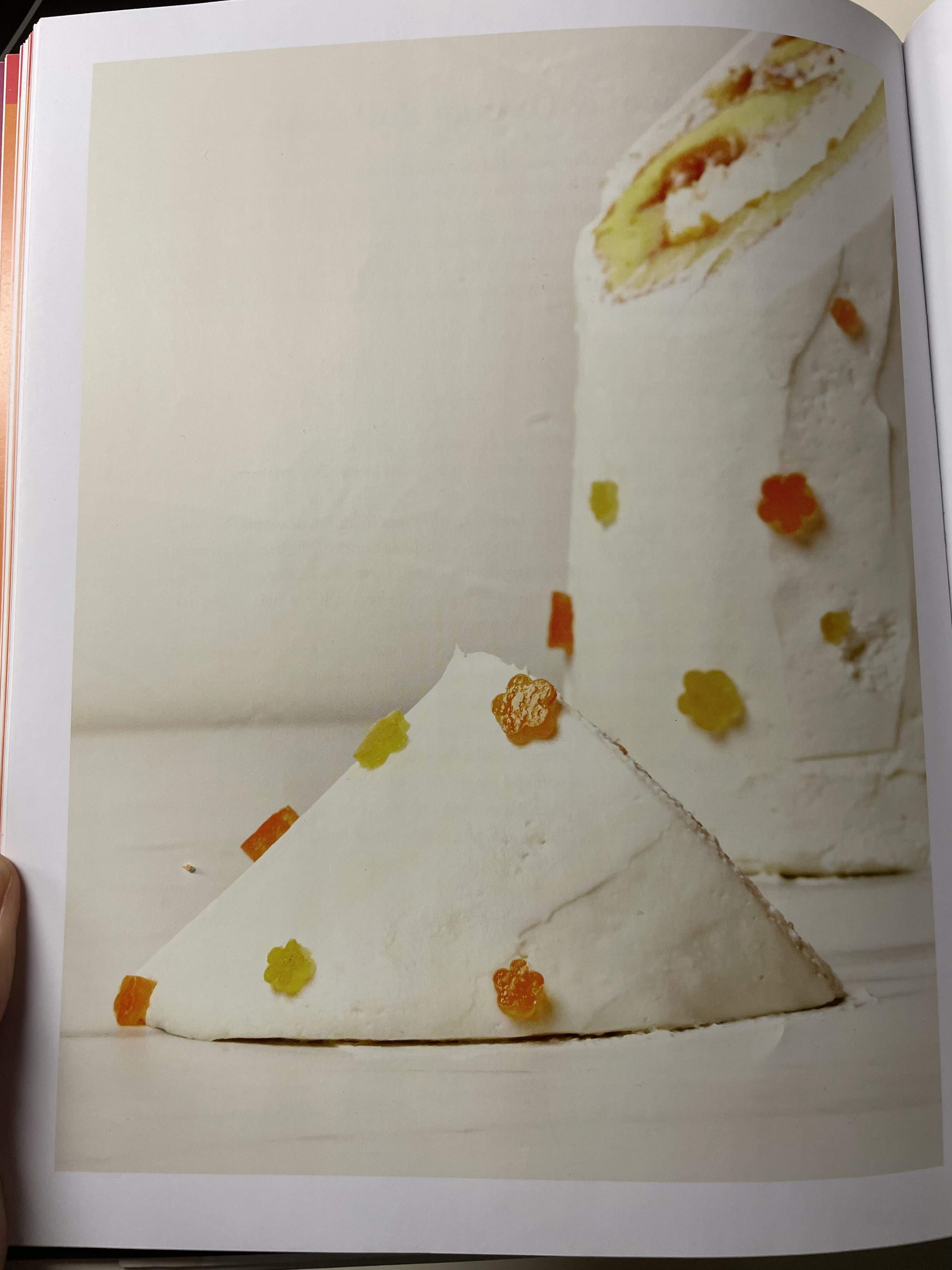I’ve wanted to make this roulade she has where you fill an orange sponge with a mixture of apricot jam and diced candied orange peel, top the jam with a layer of mascarpone whipped cream, roll it up, frost it with more of the cream, and decorate with cute candied-peel cut-outs. I DM’d the stylist for the photo in the book for help sourcing the cut-out device (she answered me- it’s a thing normally used to cut shapes in fondant.) I have both homemade apricot jam and home-candied orange peel, so I finally tested this out to see if it was Tea Worthy.™️
