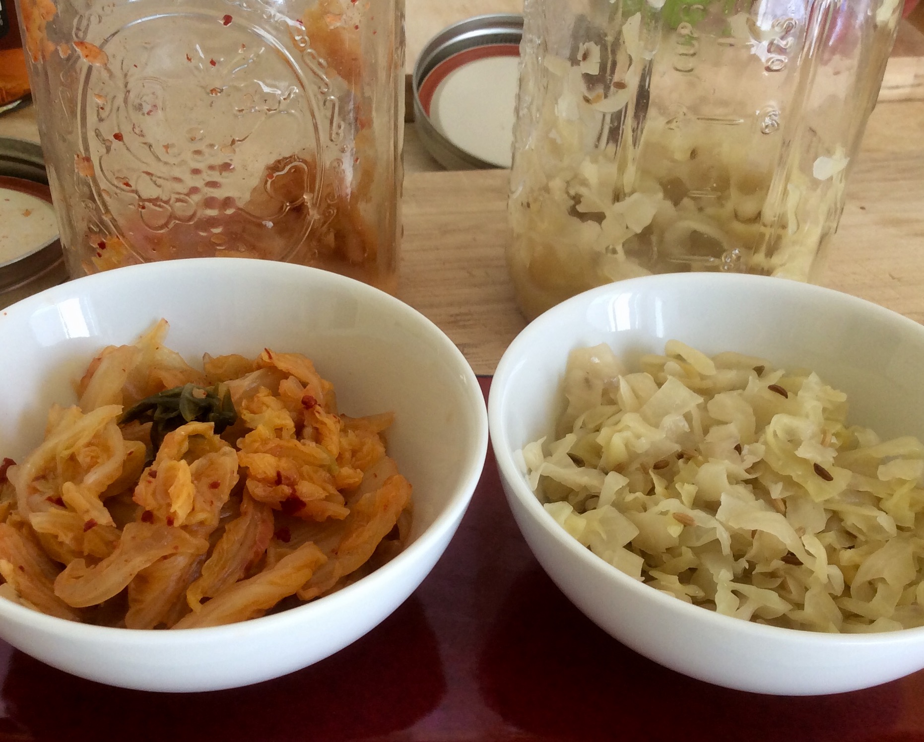 I don’t know if I posted this before, but these were my first batches of kimchi and sauerkraut. I googled like crazy for the sauerkraut, then winged it best I could. For the kimchi, I used the recipe from Gjelina.
