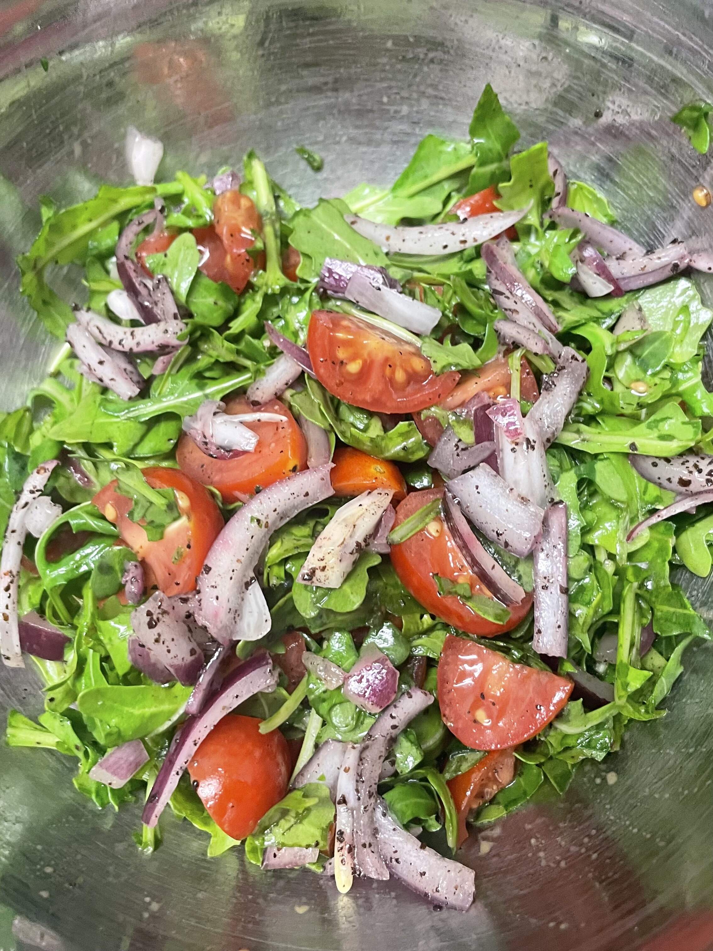 I made Piyaz – Turkish red onion, tomato, and parsley salad – but with arugula instead of parsley.