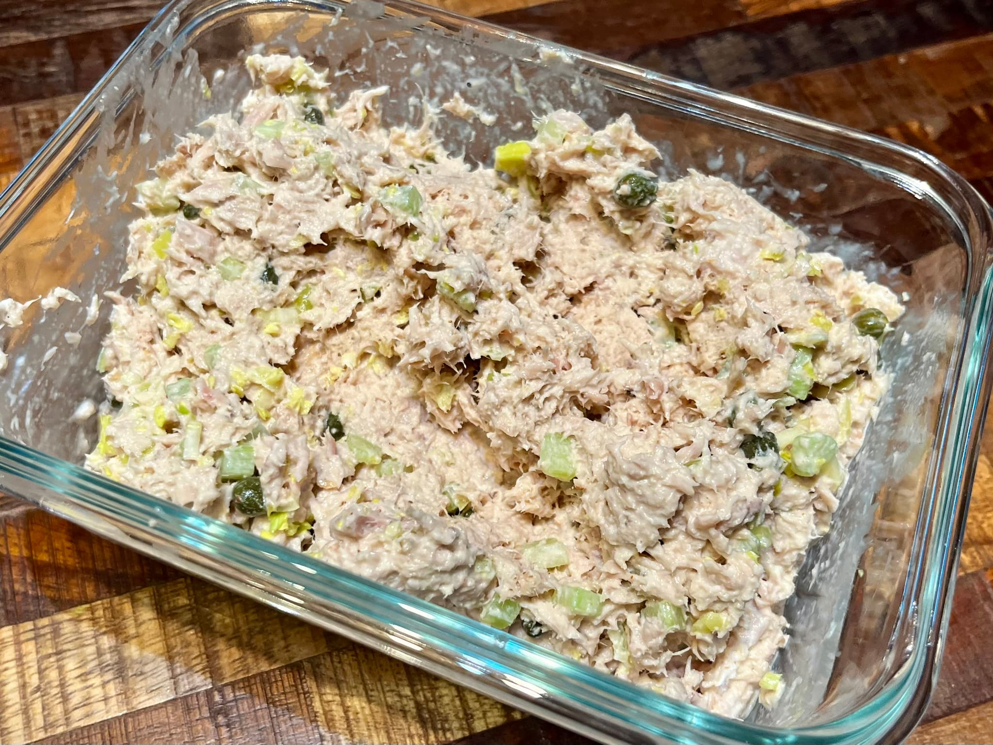MOAR toona salad for my boo: Genova yellowfin in olive oil with Duke’s, lemon juice, WWV, celery salt, brown mustard, Worcestershire, chopped golden peperoncini, chopped celery, finely chopped celery leaves, capers.