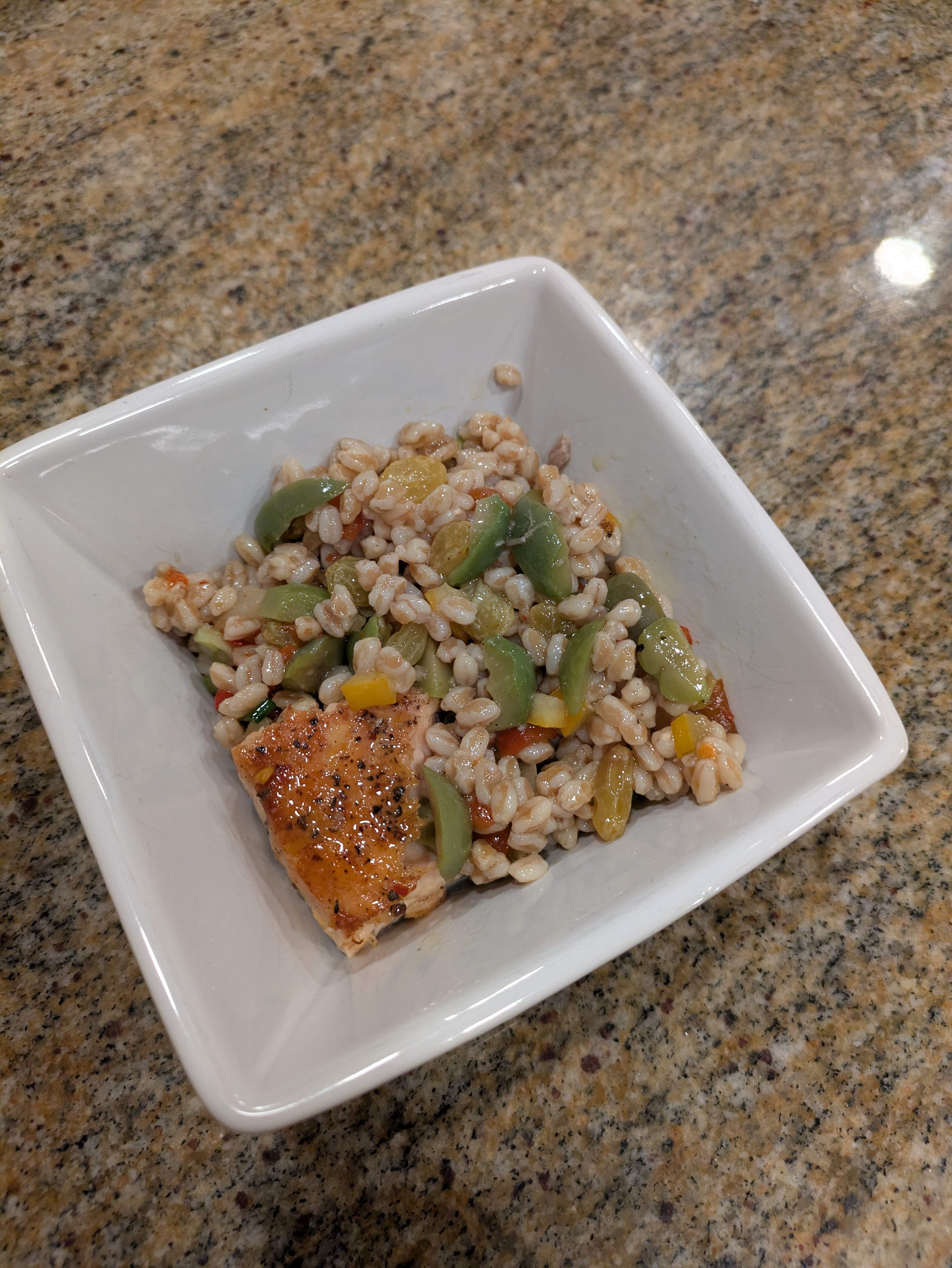Farro and “all the things '“ in my fridge; chopped preserved lemon and Castelvetrano olives, roasted peppers in vinegar golden raisins also in vinegar, citrus vinaigrette. I added chopped pistachios after taking a bite.