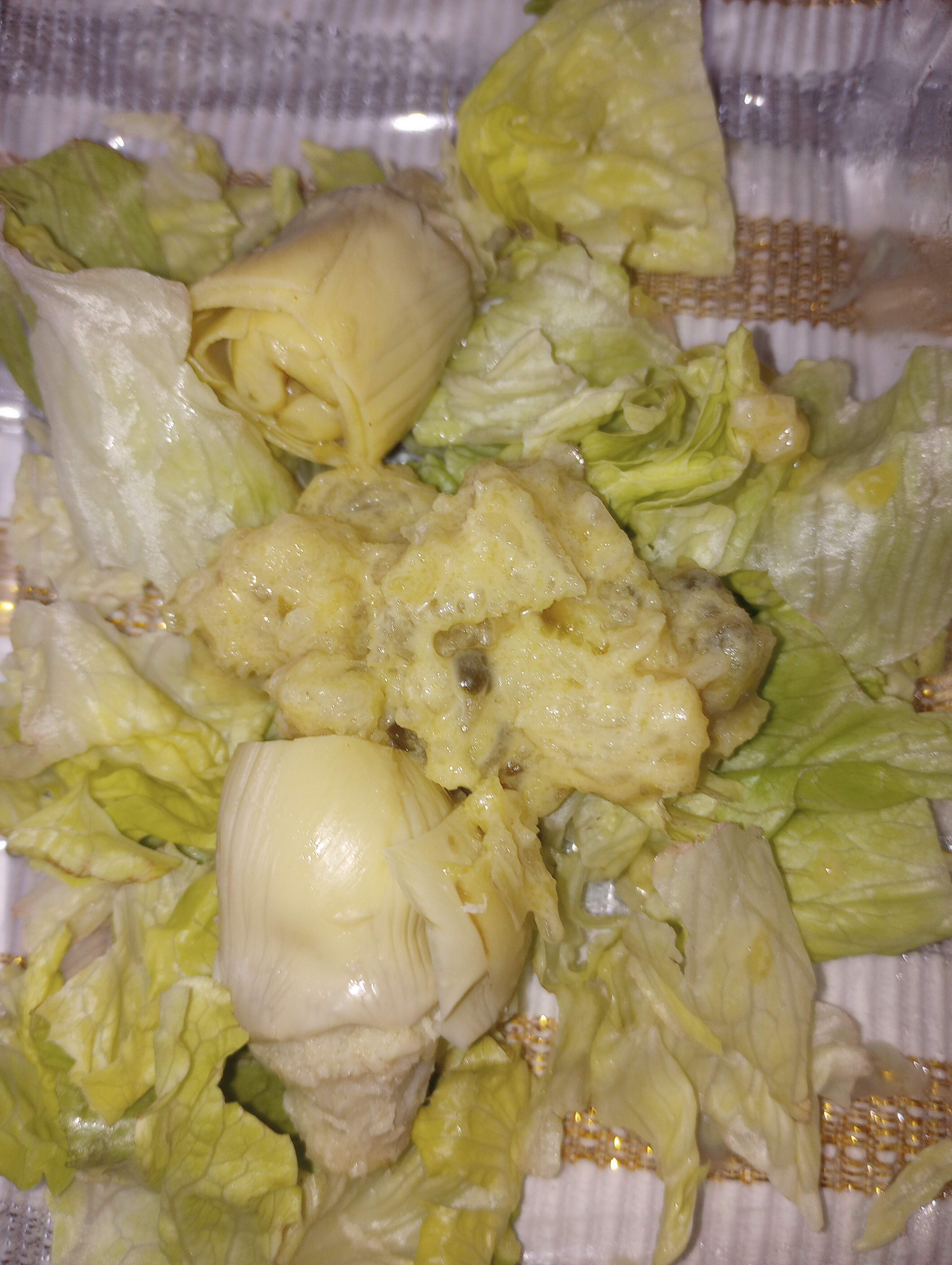 Using up a batch of April Bloomfield’s Lemon Caper Dressing, and the last of a head of iceberg lettuce, plus small artichokes.