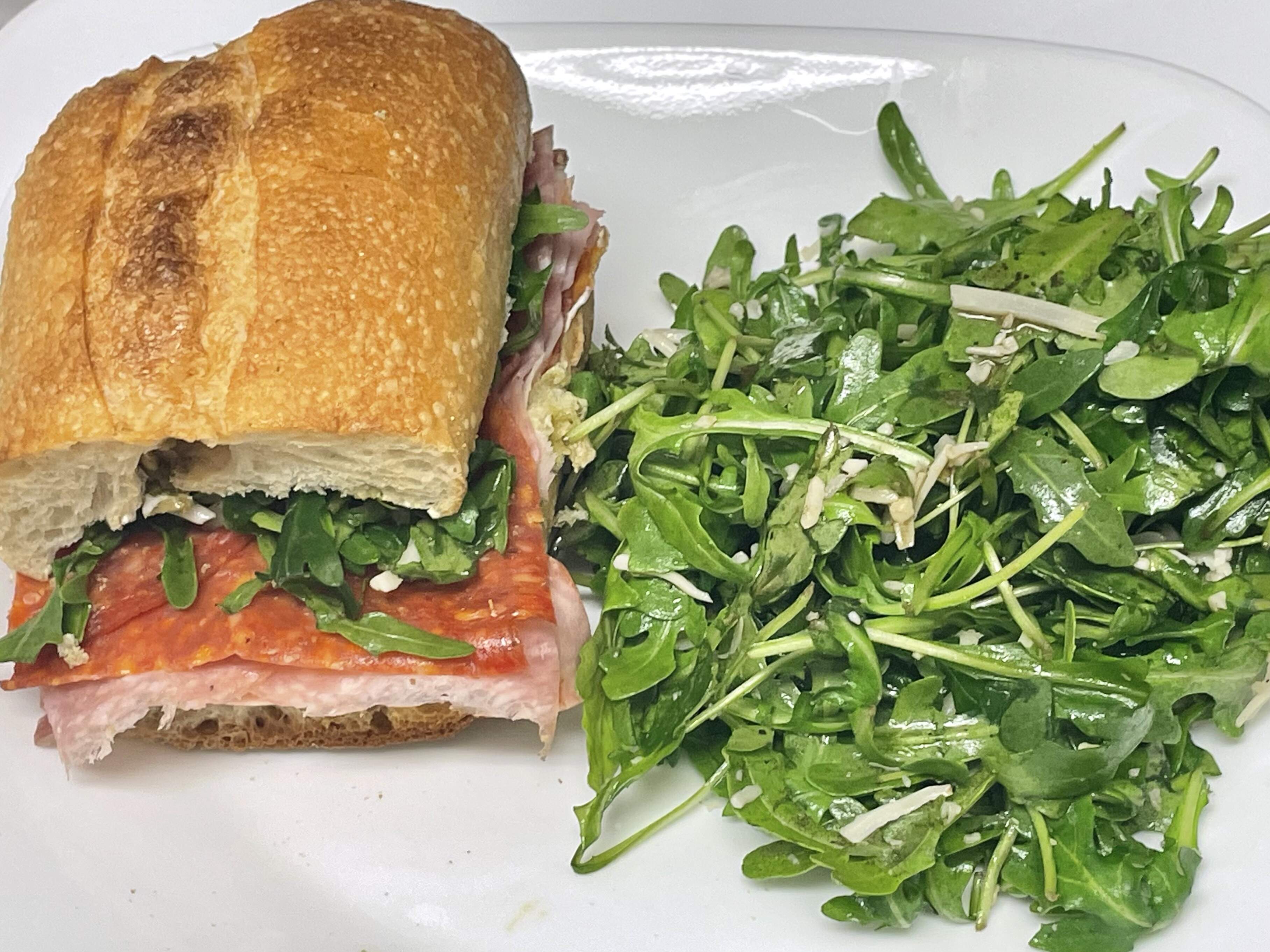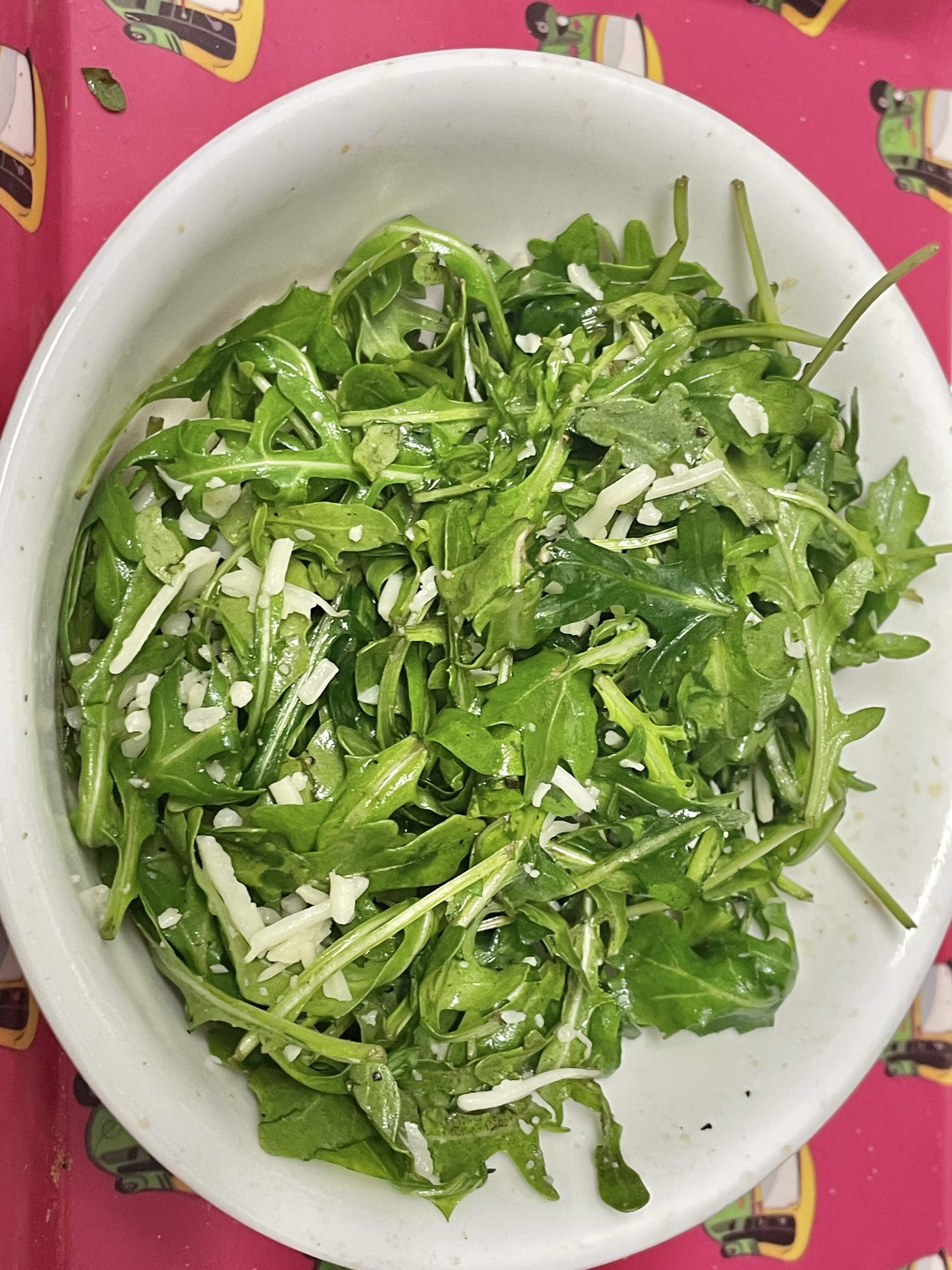 Arugula salad with a dressing of red wine and balsamic vinegars.