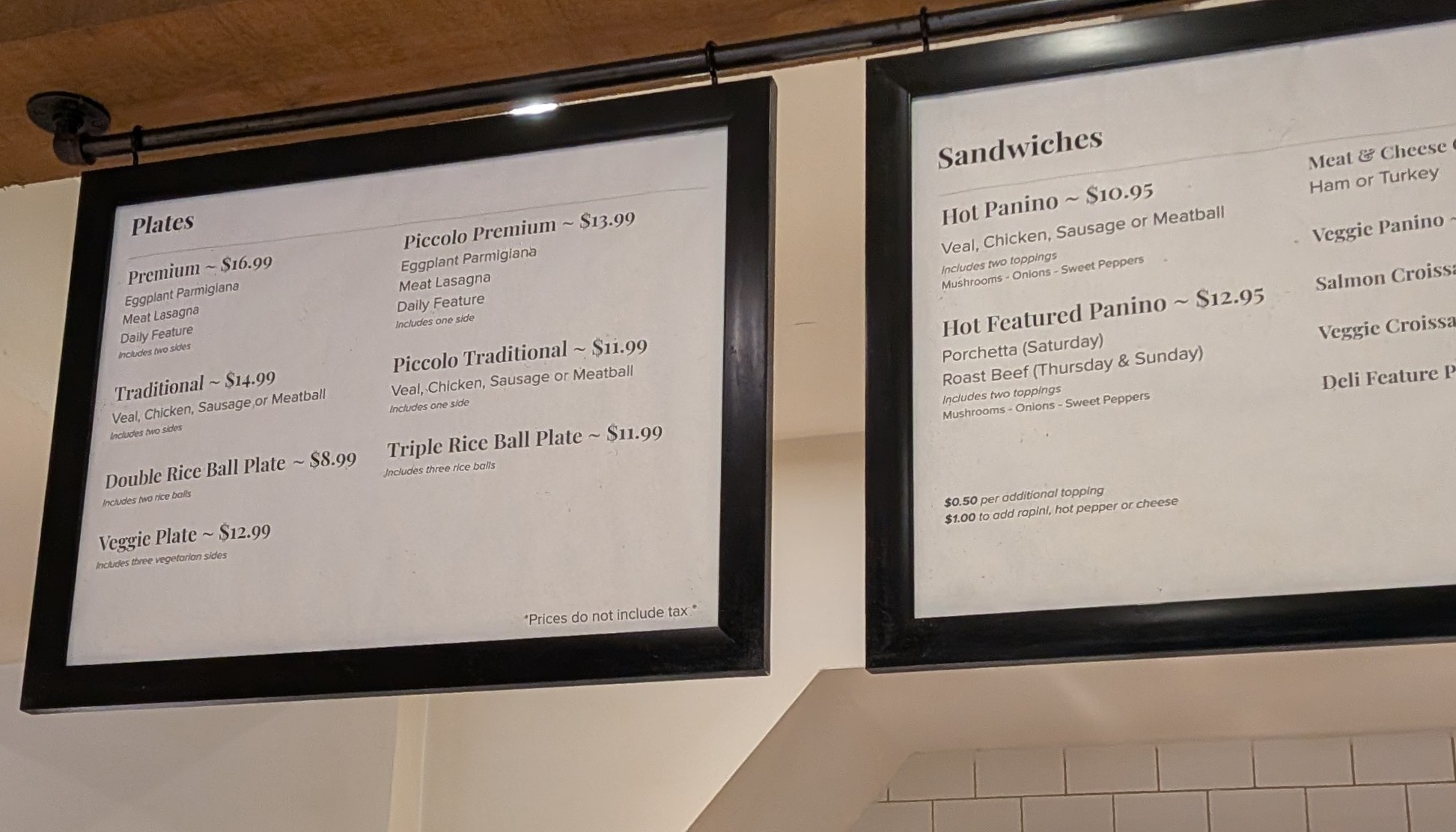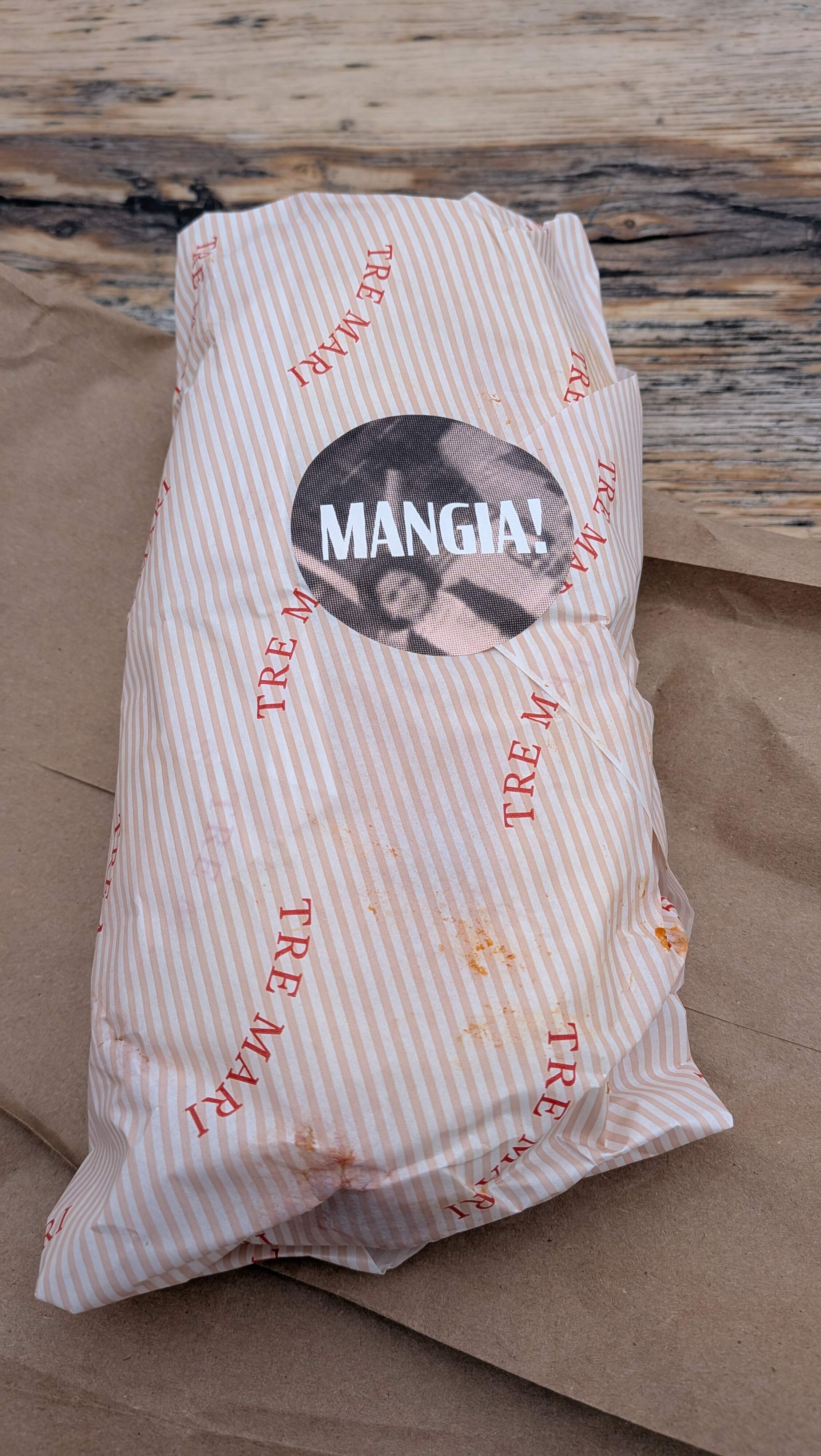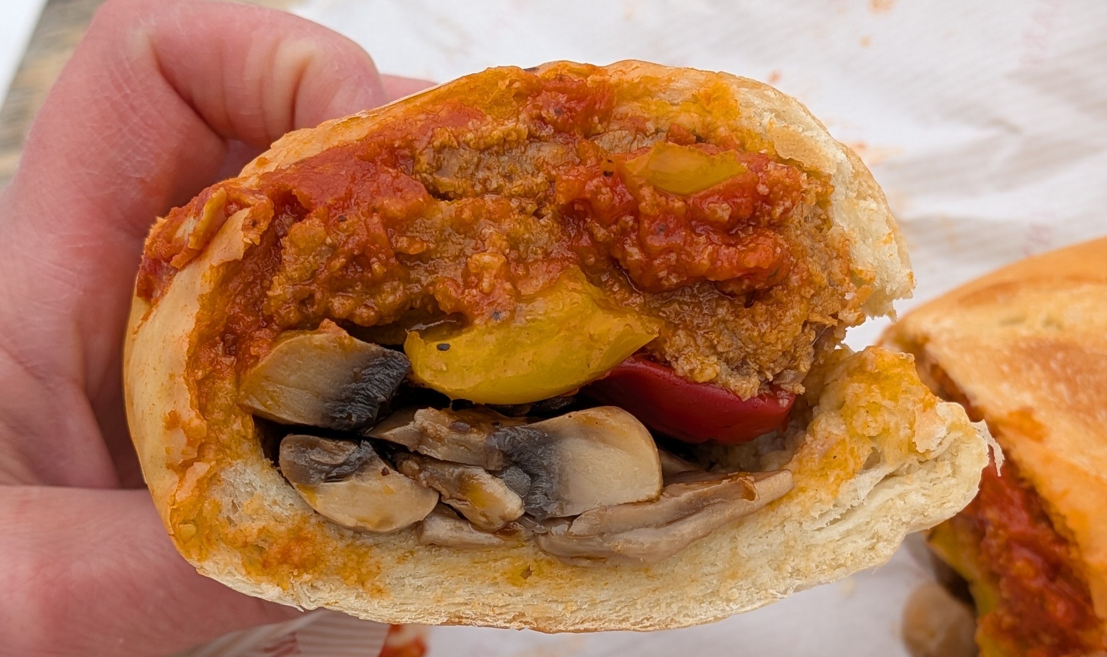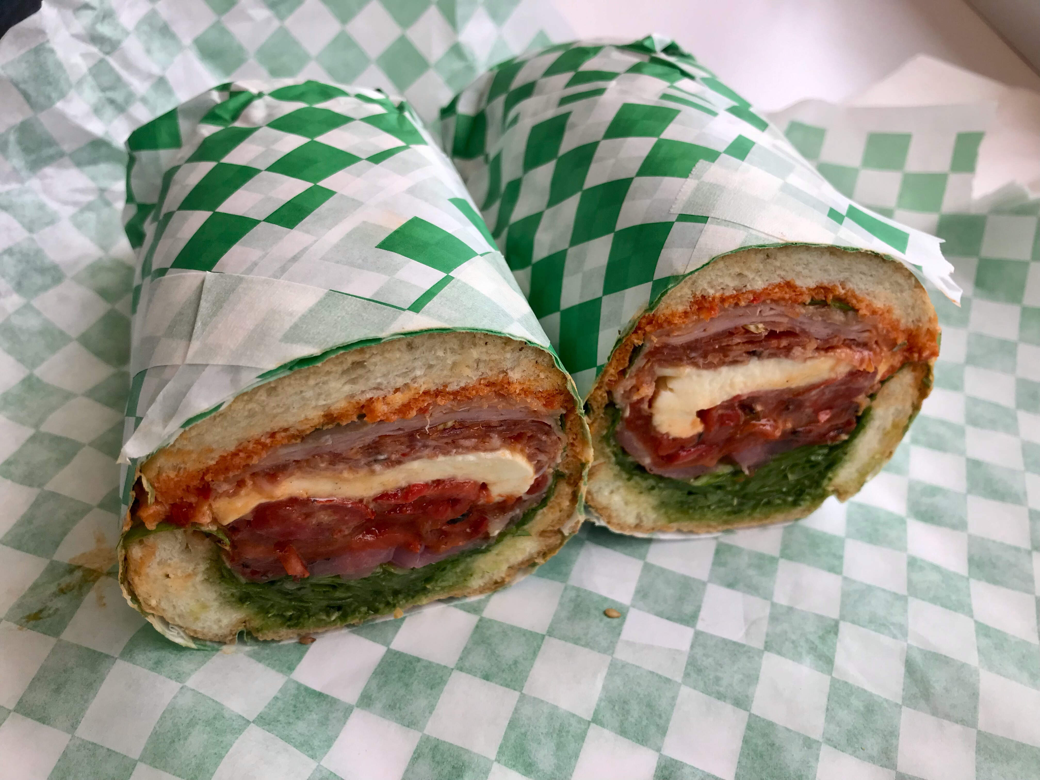 Veal panino with peppers and mushrooms made to order at Tre Mari Bakery’s hot table.