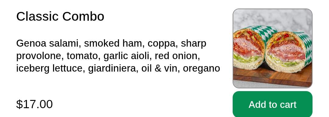 Substantial sandwiches. I like the Classic Combo more than the Italian Trio.