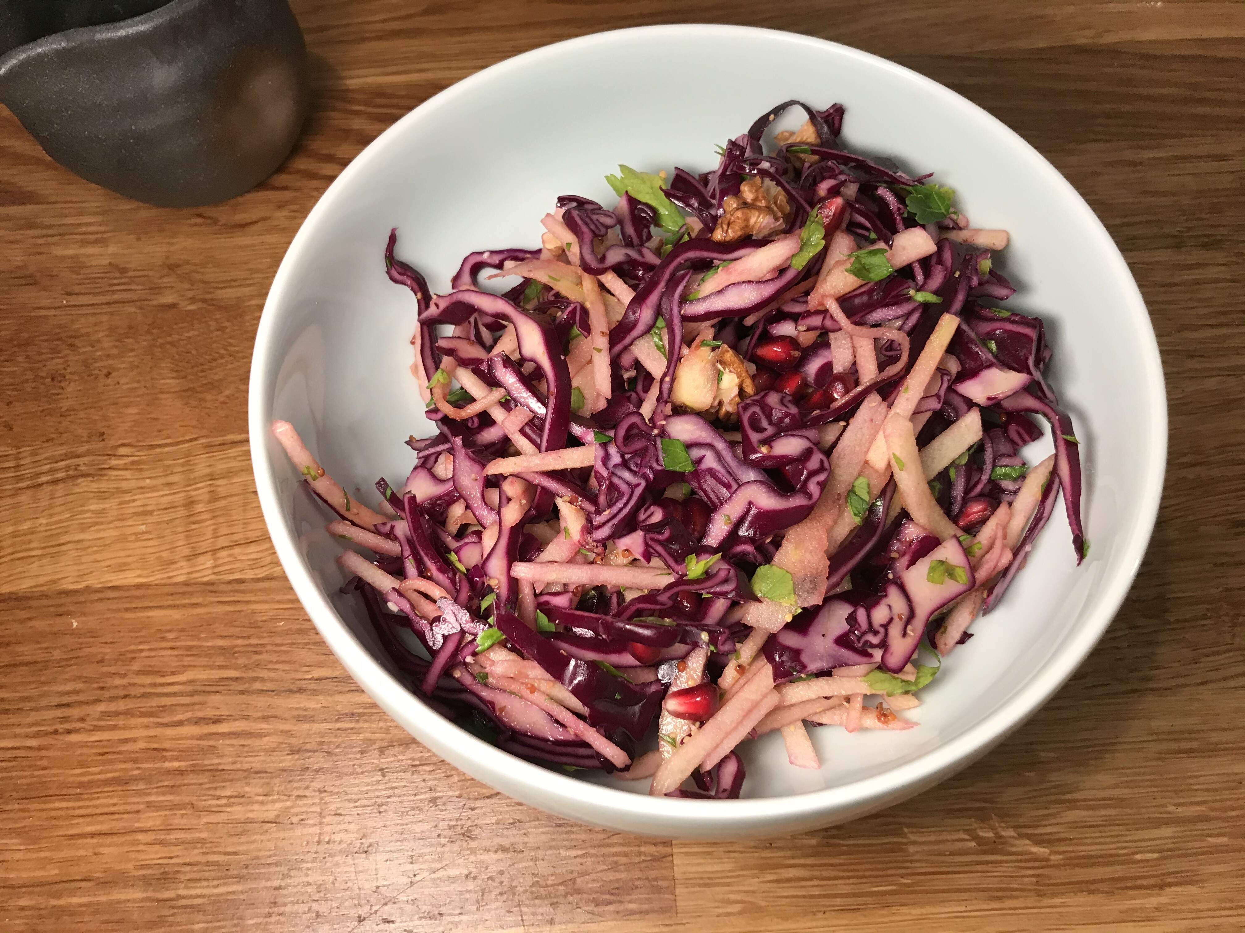 The recipe said Flæskesteg is a Christmas dish especially for the Danish people, and this tradition slowly traveled to its neighbours in the north. The pork roast with rind was score across the fat, it was then rubbed with salt and cooked with black pepper, cloves and bay leaves in oven for 45 minutes. Potatoes were boiled with water, and cooked in pan with melted sugar caramel to coat. Served with a meat reduction sauce with heavy cream. The cabbage apple slaw had walnut and pomegranate with sherry vinegar and mustard and brown sugar.