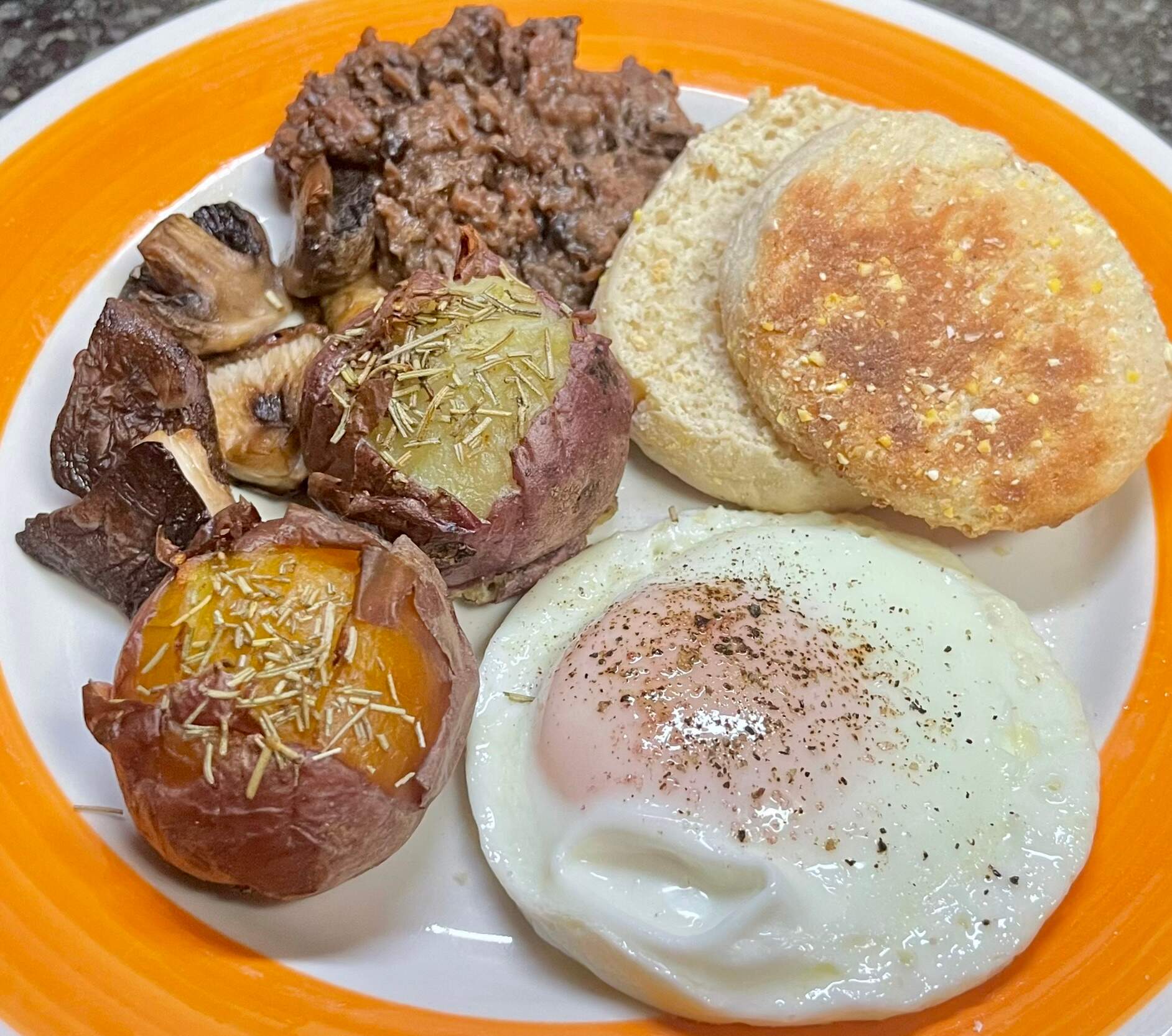 It is Scottish breakfast for dinner time yet again, and I still have some of that vegetarian black pudding left, god help me. (I’ve grown to like it.) Can I call that English muffin a crumpet? Who’s to stop me! Added some roasted mushrooms this time, because I had mushrooms.
