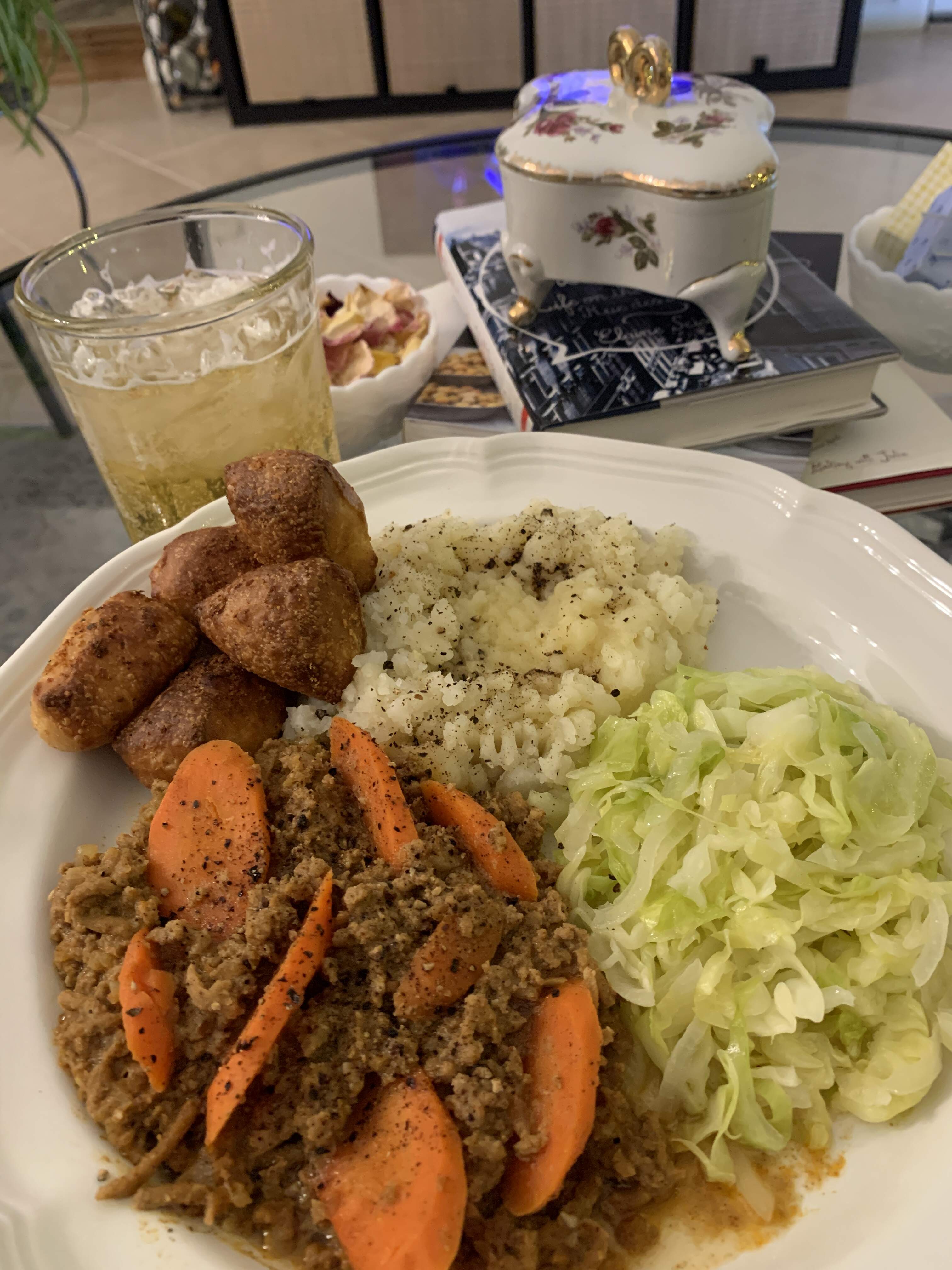 Mince, tatties, sautéed green cabbage and onions, garlic bread bites.