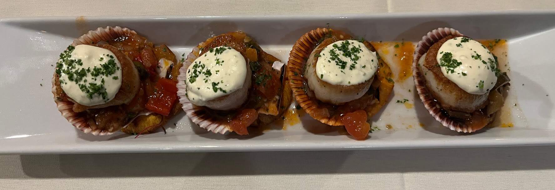 I’d been meaning to try Scutra in Arlington Center for quite some time now, and never made it there when their lovely patio, which is right on the Minuteman bike path, was open for dinner. The occasion arose where I needed to meet someone at a location with parking for a quiet meal, and it lined up with Scutra’s limited days of dinner service. My friend and I were promptly seated in their comfortable quiet dining room, and started with the seasonal spritz cocktail. We shared an order of fried artichokes as an app, then I had scallops and she had shrimp as our main courses. I had a scoop of gelato and a decaf coffee for dessert, and she had the creme brulee. Everything was fine; nothing was outstanding. This was a classic example of a menu that needs editing. I felt many of the plates had one too many flavors on it, or things that clashed, such as a miso-glazed fish with tomato chutney. There also were an inordinate amount of sweetness to many of the plates, from the highly maple syrupy sauce with our artichokes to the extremely sweet spritz cocktails. The overarching theme seems to be “modern European,” but there are various Asian flavors sprinkled in as well. The scallops were perfectly cooked, but served in a condiment of very sweet eggplant caponata in their shells…which were then perched on top of the sweet potato in such a manner that the sweet potato had to be scraped off the bottom of the shells to be eaten. Service was excellent, and we had an enjoyable dinner. Maybe the combinations will be more to another Onion’s taste than mine, but I would probably only go back if the patio is open and the location and need for parking and good service are paramount.
