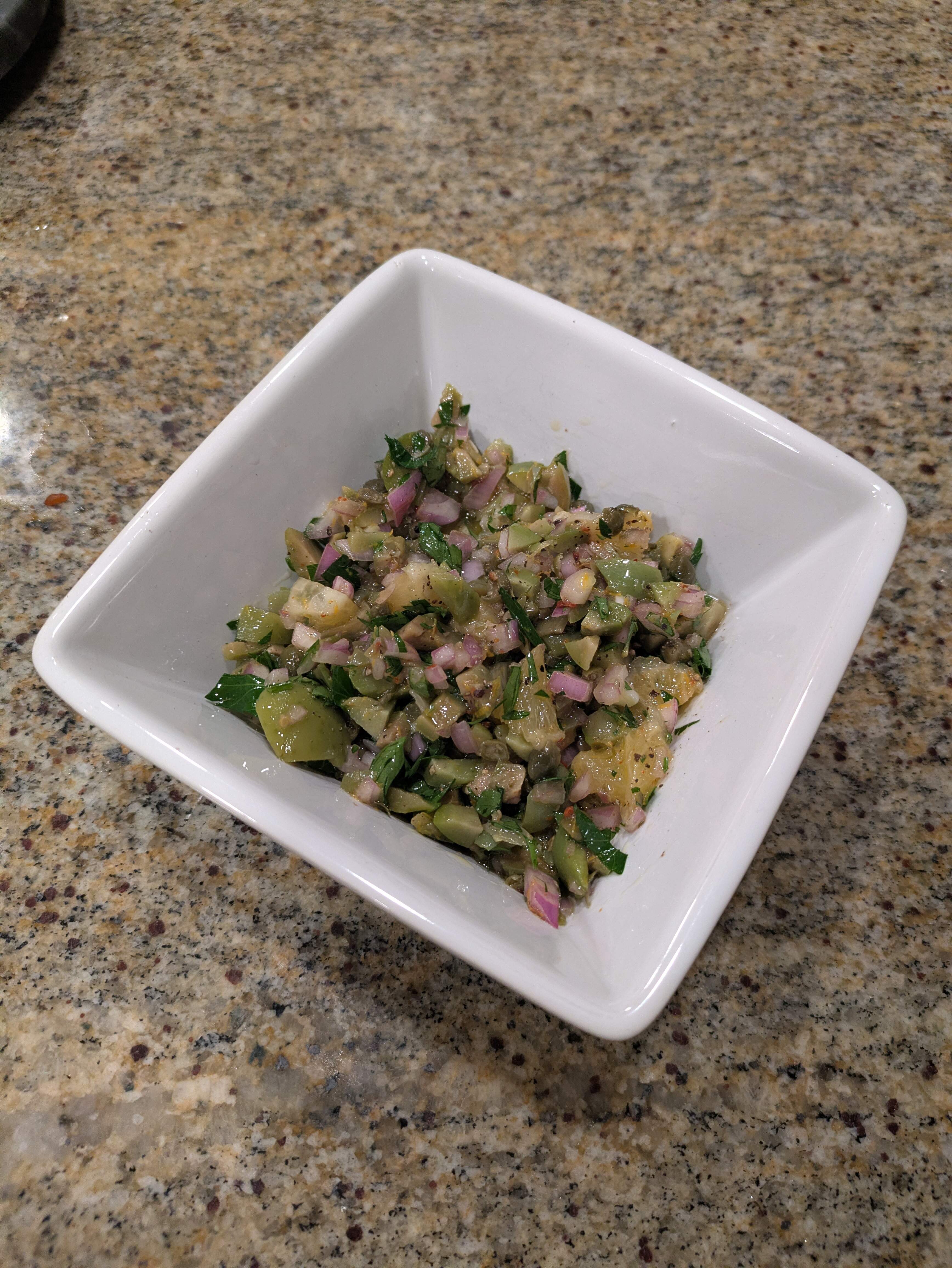 Tasty, but apparently I don’t have the knives and knife skills for “finely chopped lemon segments”.