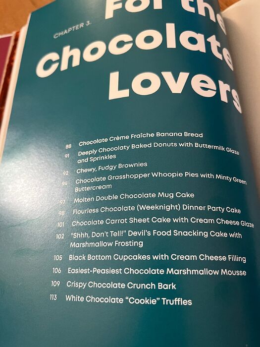 I was wondering if anybody has a list of the chocolate dessert titles? I’m thinking about buying this book but my fiance only likes chocolate desserts and the sample I downloaded only had the fruit ones.