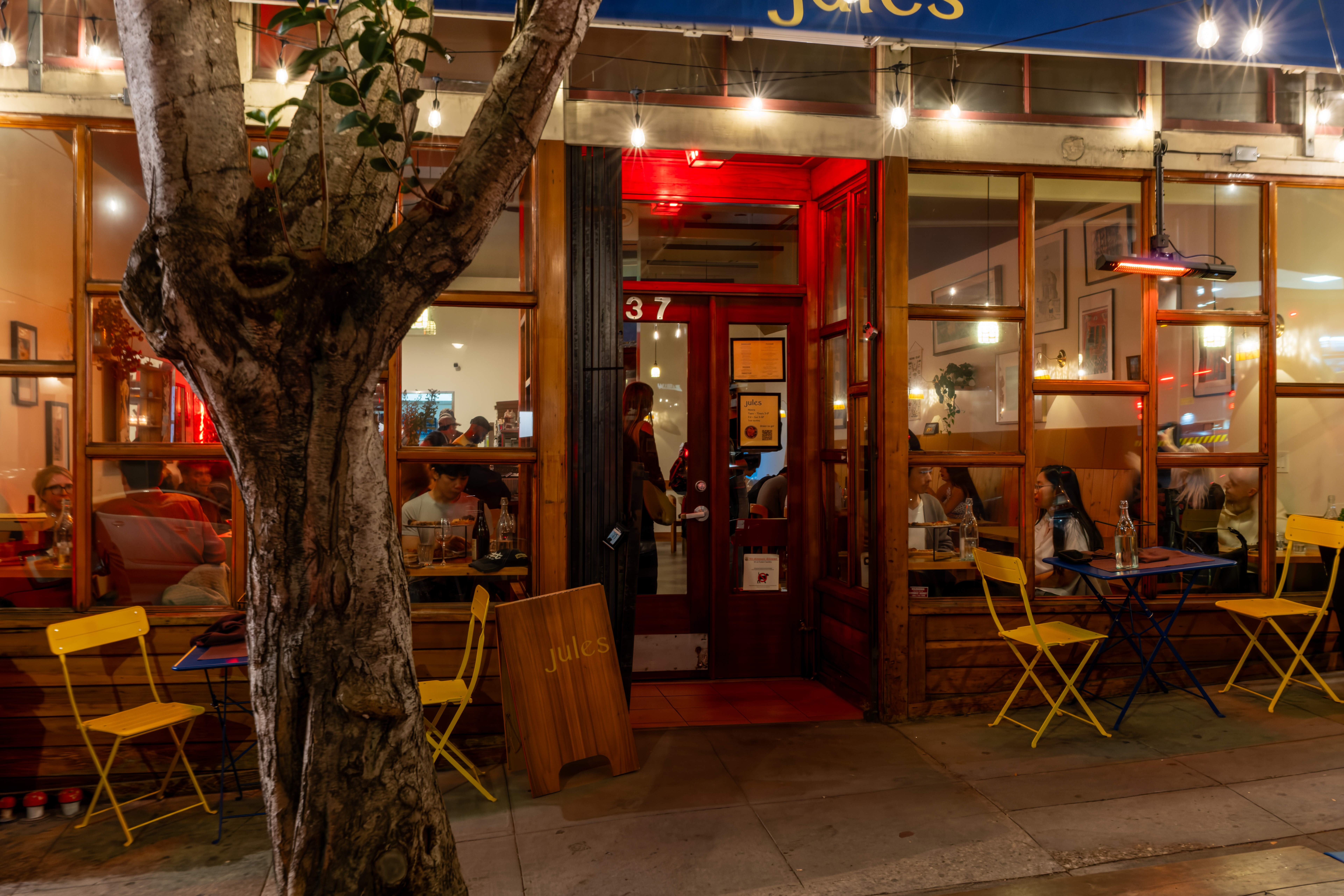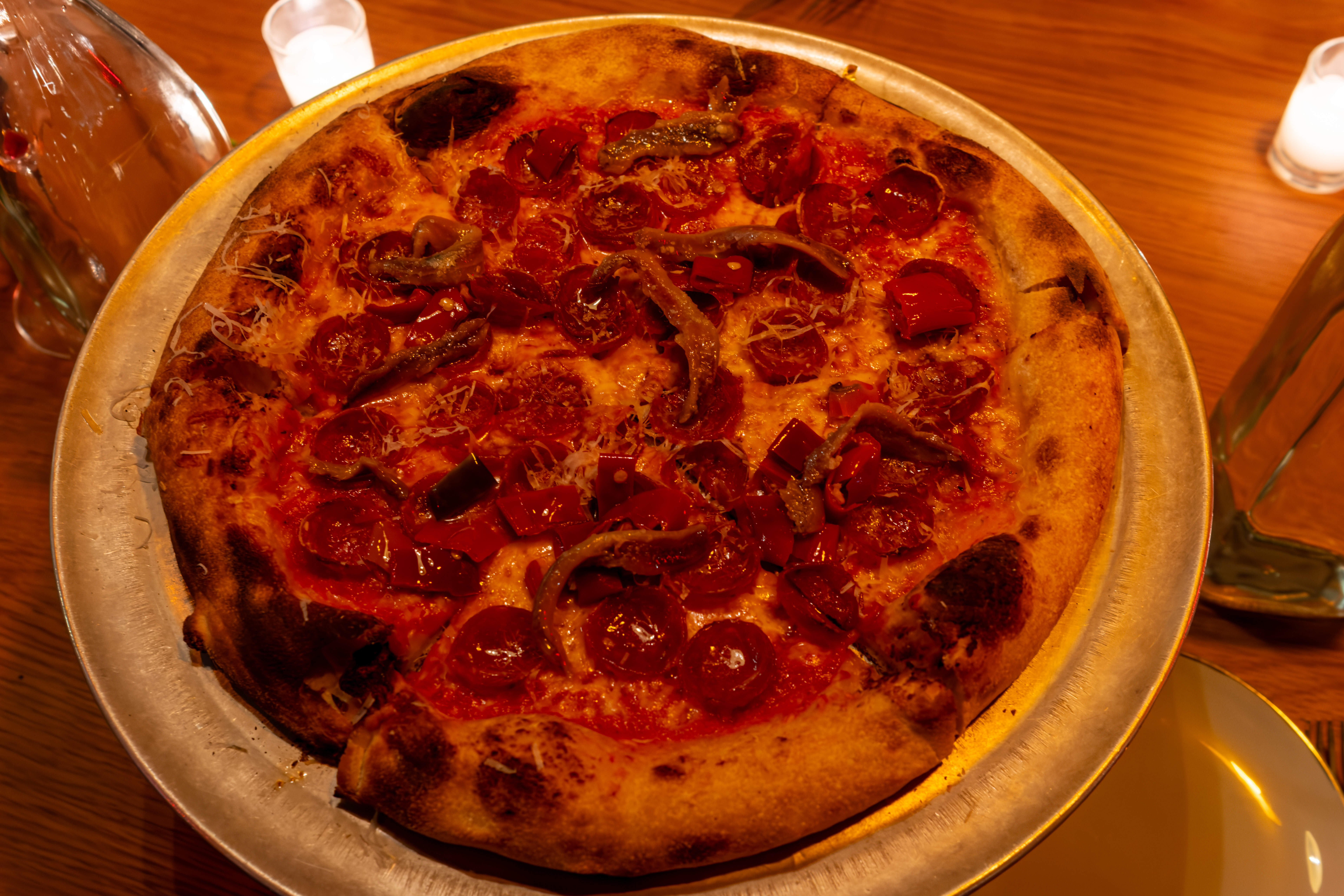 I had a pizza at Jules today, walked in without a reservation and got a seat at the communal table. I had Spicy Ronny ($25), which has tomato sauce, mozzarella, caciocavallo - which according to Wikipedia is a bit like a provolone, pepperoni, parm, ajika chili flake, and calabrian chili. I also added Sicilian anchovies (+$4). It was a very good pizza. The toppings were plentiful - there were a lot of cupped crispy pepperoni, and the anchovies were very nice. The crust was very good - nice texture and a nice tangy sourdough flavor.