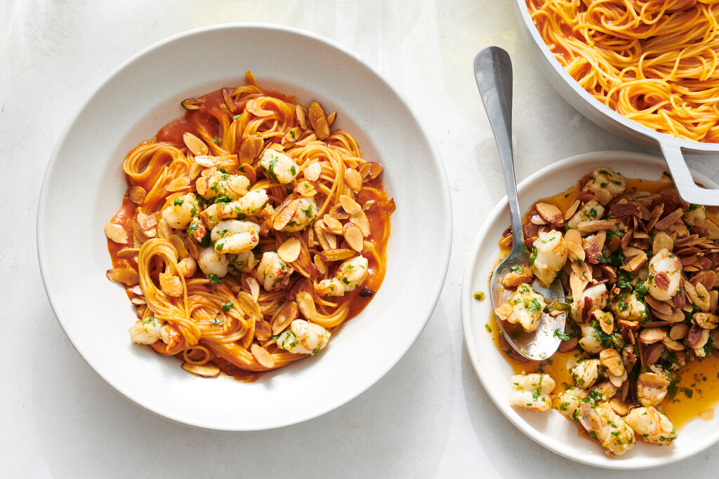 Excellent recipe. I made it mostly as written except that I dropped the olive oil to probably just under half a cup, and doubled the garlic and paprika. (I like smoked paprika a lot.) I was a bit skeptical of cooking the pasta in its sauce, but it worked perfectly. The flavor of everything, shrimp included, was dead-on. Only thing I didn’t like was the almonds: The textures of the shrimp and pasta together matched really well and I found the combination to be deeply comforting. And then the almonds come in with a crunch that, for me, was kind of angular and woke the whole thing up a bit too much. I will absolutely make this again and will omit them. Some kind of softer garnish could be interesting - or maybe just smaller or less-fried pieces of almond. (I used slivered almonds, and cooked them as per the recipe.)
