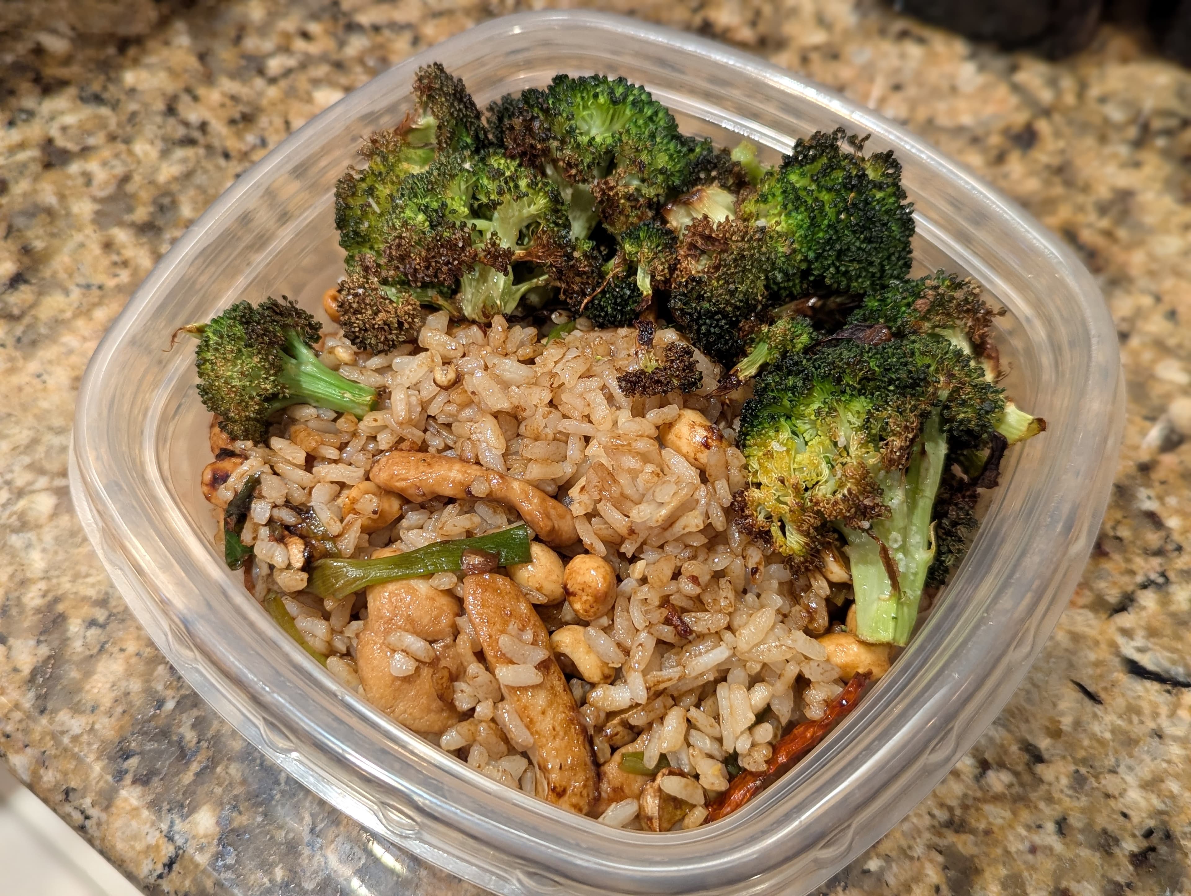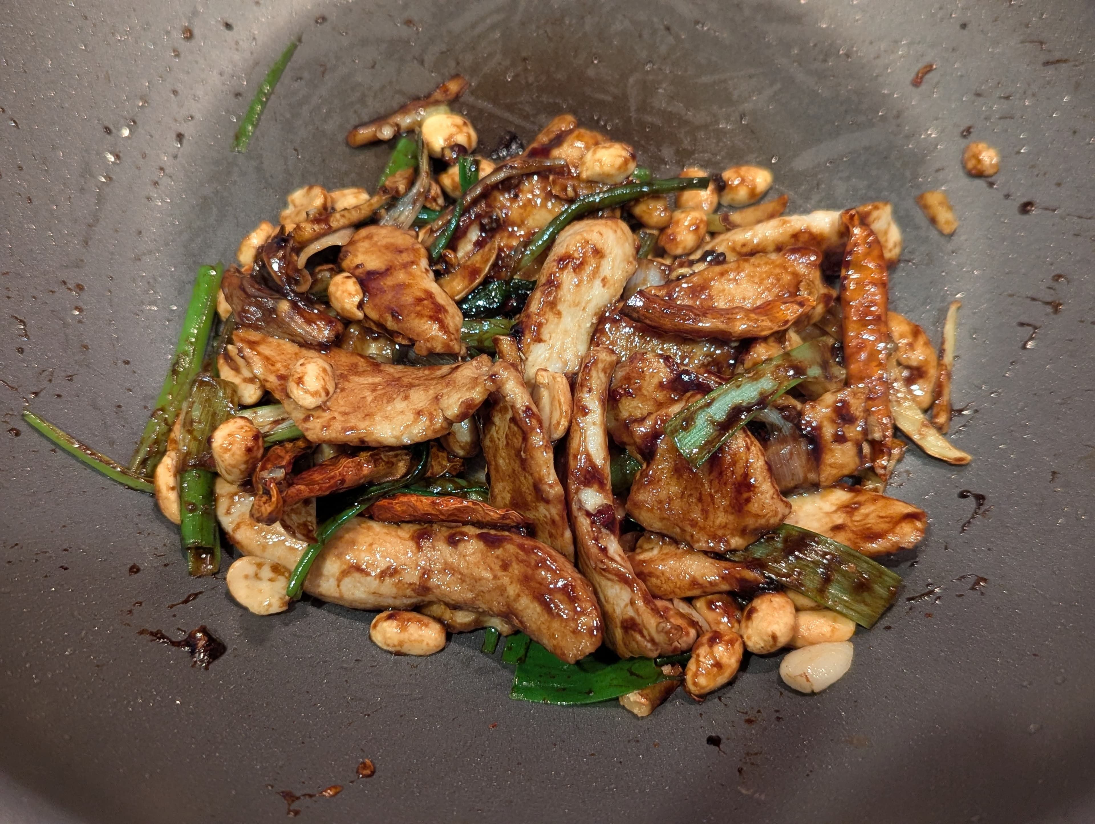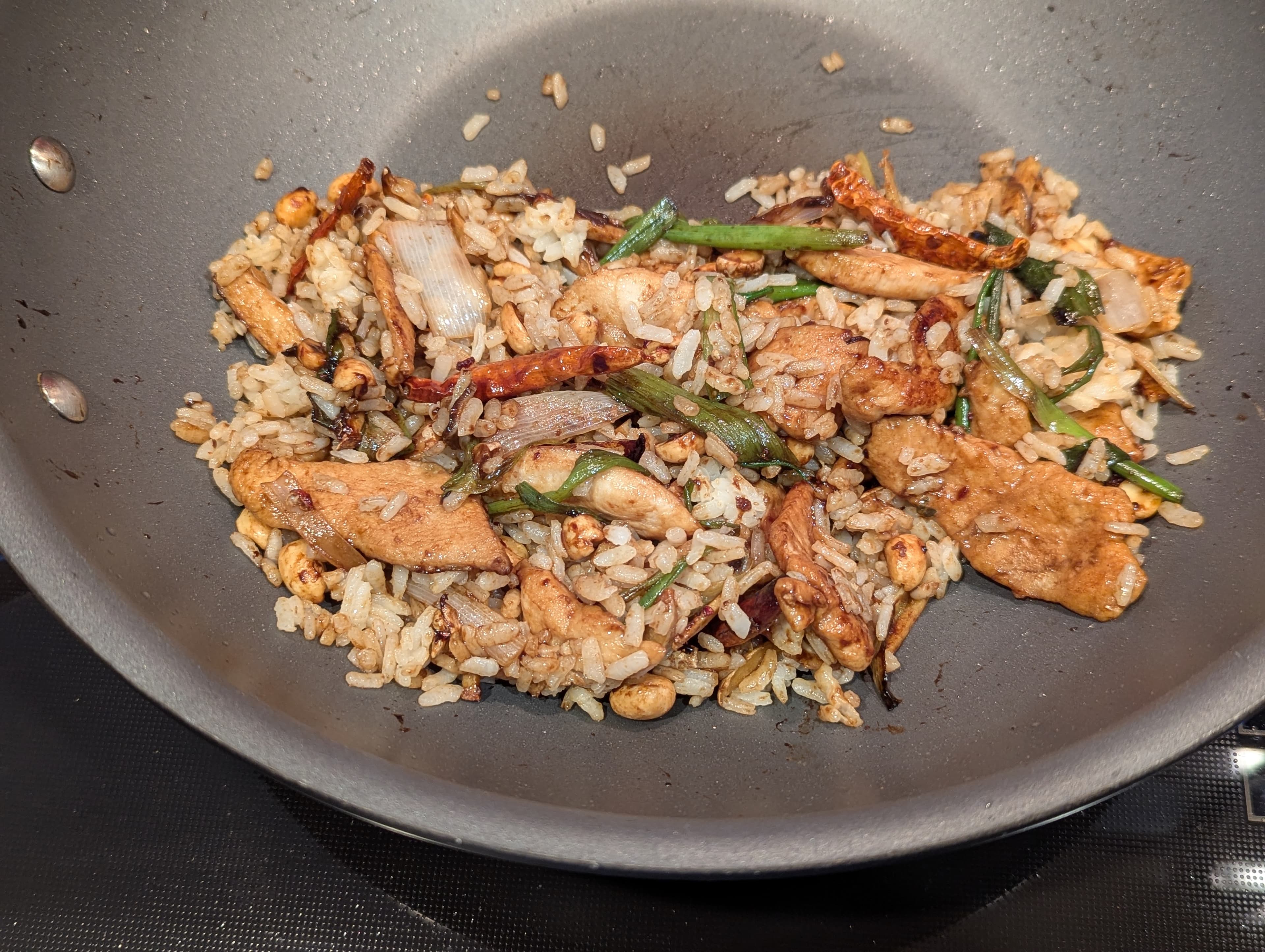 So, I made Fuchsia Dunlopâs kung pao chicken today for tomorrowâs lunch. It pretty quick work marinate chicken in soy sauce, wine, corn starch, and water. Then stir fry with ginger, garlic, scallions, red chiles, peanuts, and Sichuan peppercorns (click the article for the correct order to add stuff to your wok!). Then sauce it up with black vinegar, light and dark soy sauce, sesame oil, water, and a touch of cornstarch. It doesnât make a ton of sauce (itâs intended to be one of a few dishes to eat with rice at a meal), so if you like sauce triple or quadruple the sauce part. I had some leftover rice, so I decided to turn it into a kung pao inspired fried rice. I will have it with some broccoli tomorrow. Everything tasted great while I was making it, so I am very much looking forward to tomorrowâs lunch!