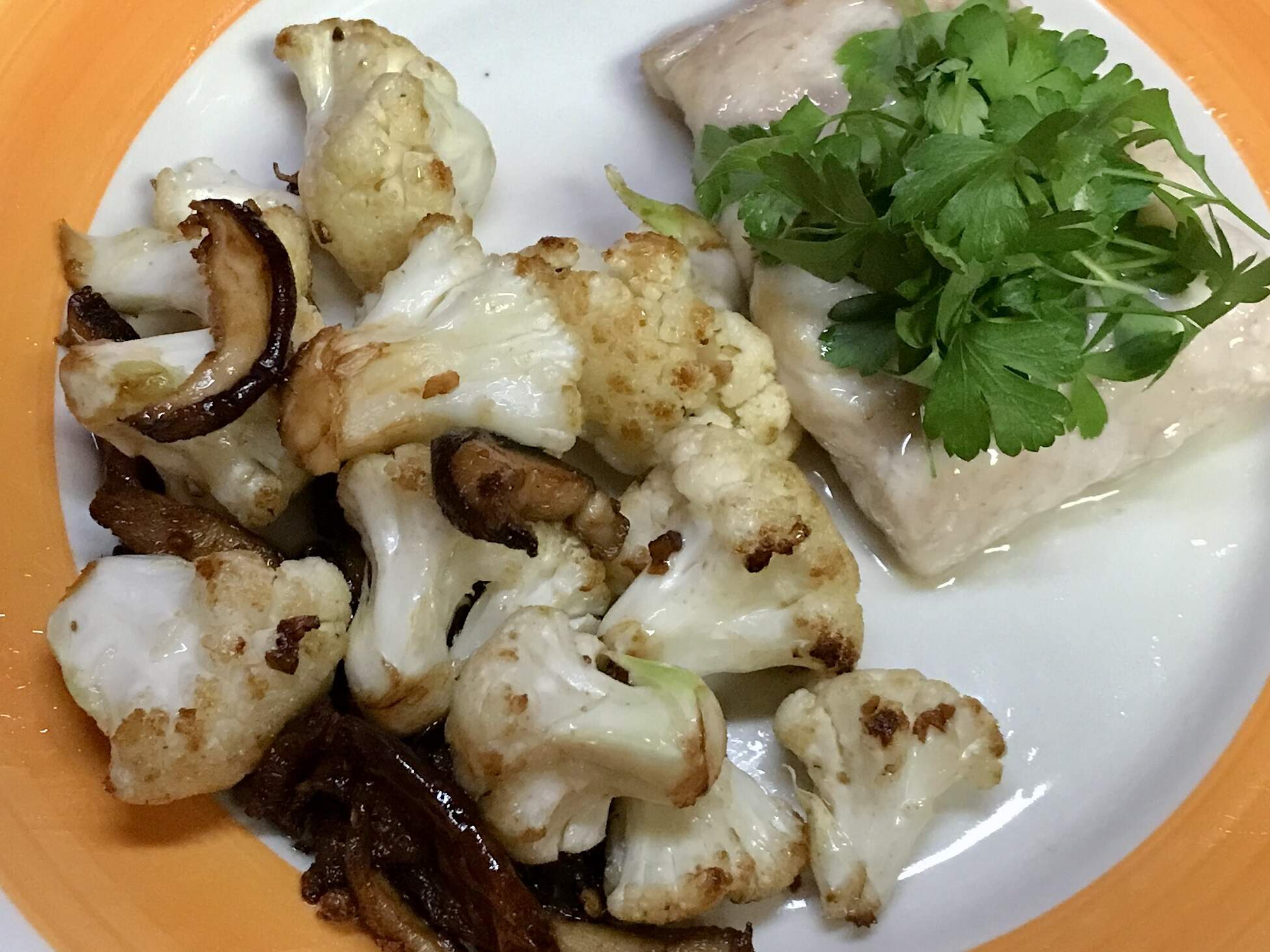 Sichuan cauliflower and shiitake mushrooms, summer shark with rice vinegar and cilantro (Sichuan adjacent).