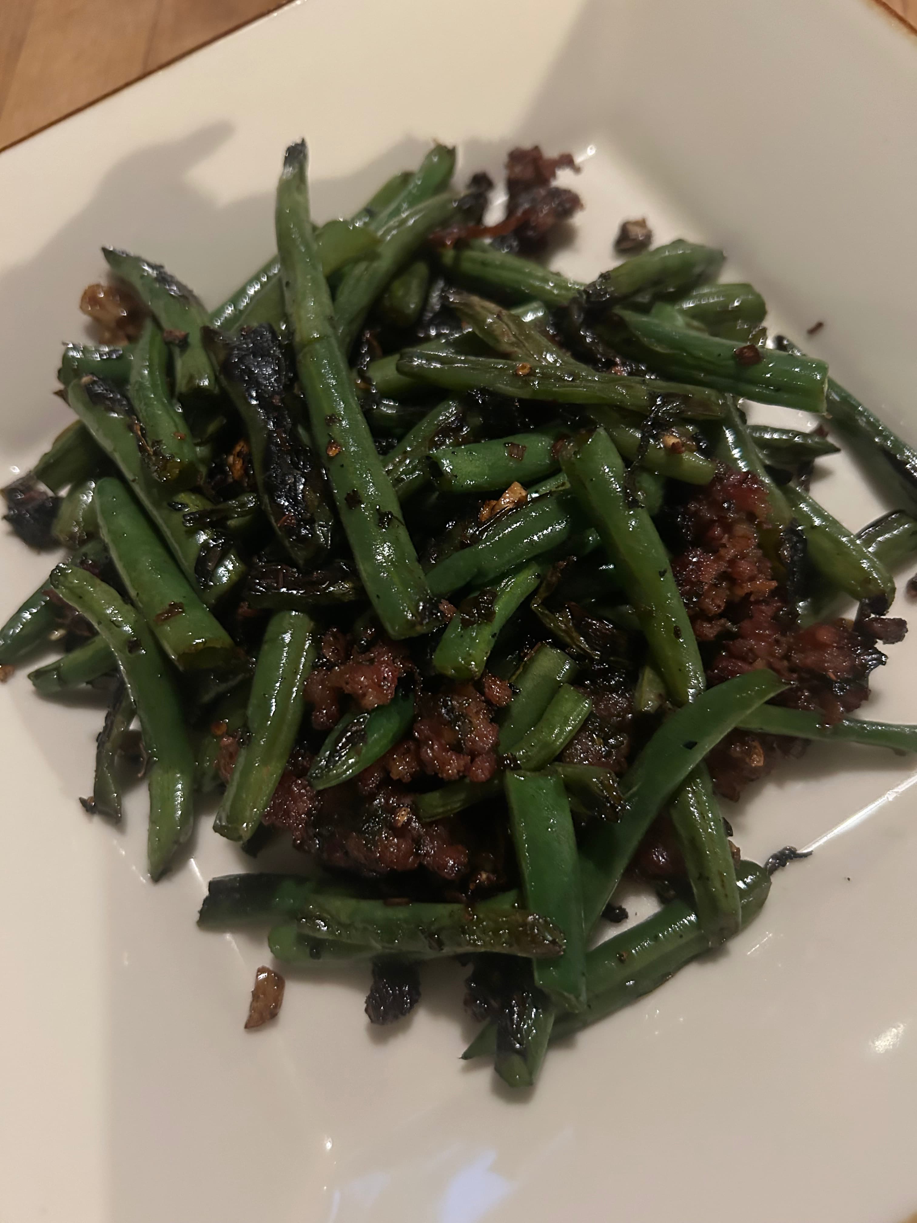 Made the Sichuan Dry Fried Green Beans from WofL pre-turkey day. Opened up a link of the lemongrass sausage from the SE Asian Market here in Phila in place of the regular ground pork. Worked well @linguafood but since I can’t get more until May I’ll stick to pork next time. I also added some Sichuan peppercorns because why not!