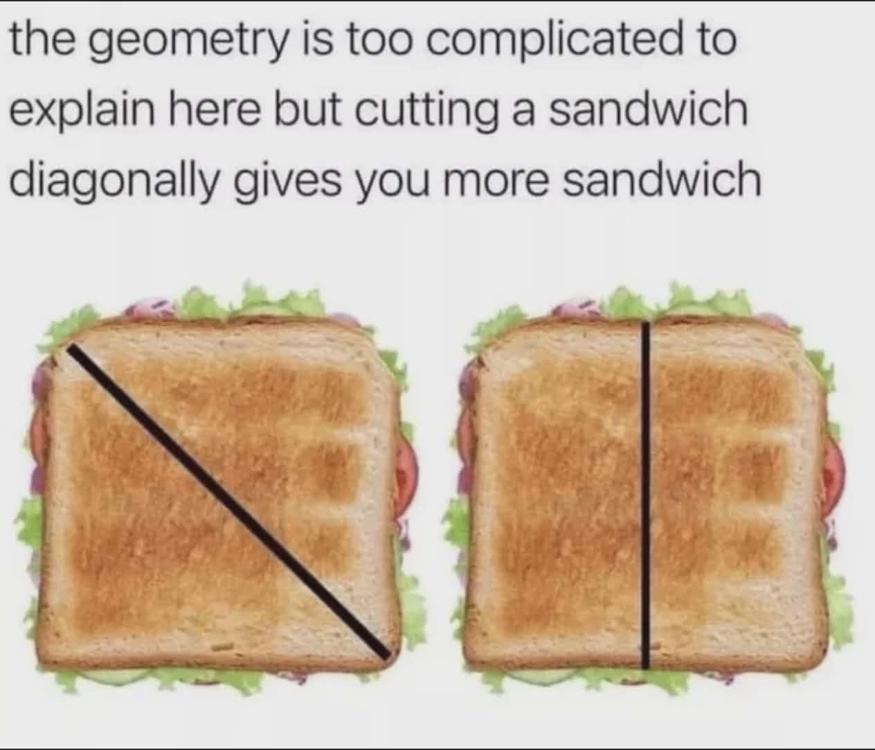 I don’t know if it gives you more, but (according to Sunshine) it is easier for an individual with only one working hand to eat a diagonal cut sandwich.
