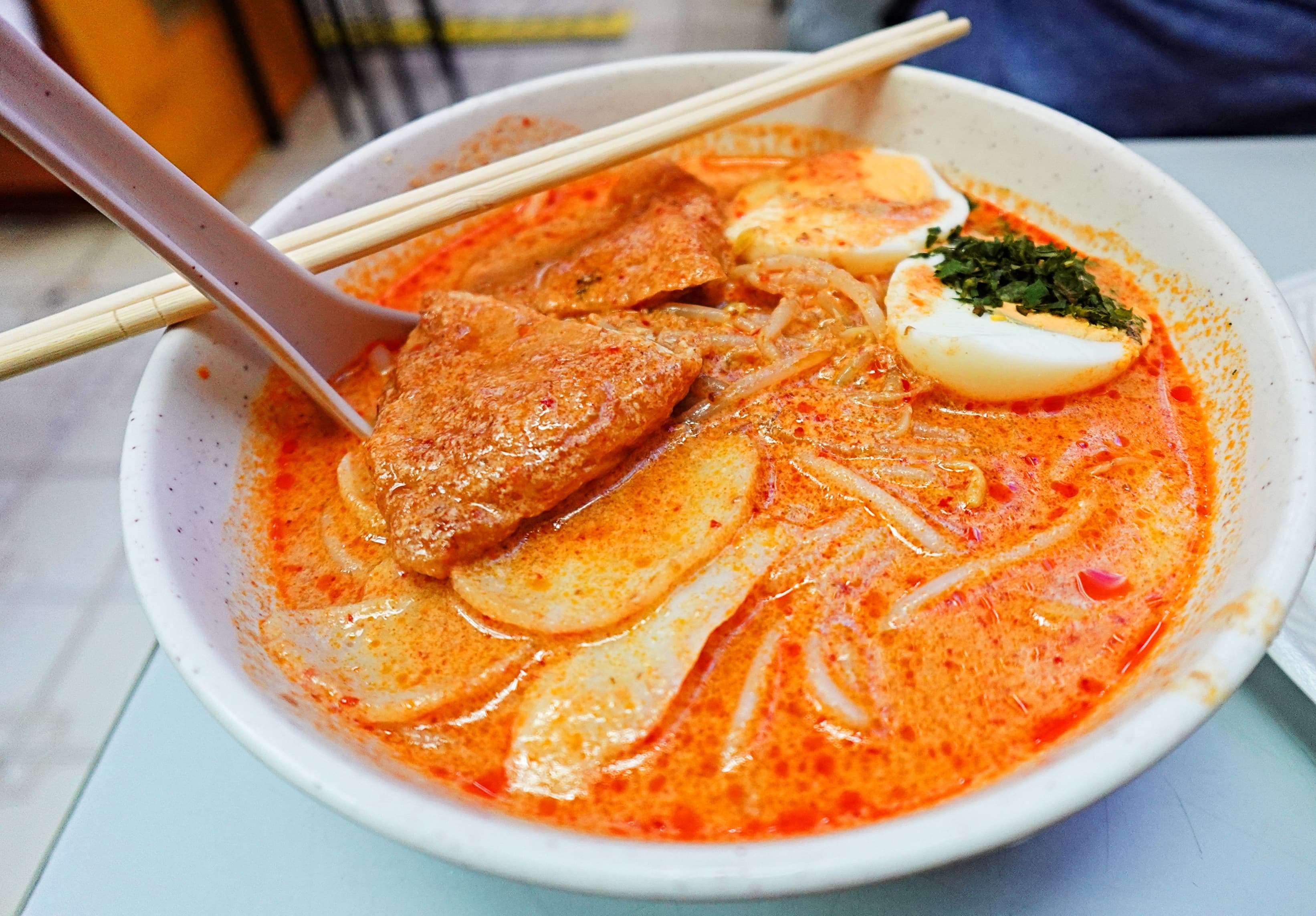 There are so many Nyonya laksa spots in Singapore - all with the same taste profile, but some are better than others. The Nyonya laksa here is definitely up there among the best: think rice noodles (โchor bee hoonโ), garnished with tofu puffs (โtau pokโ), sliced fish cakes, hard-boiled egg, sprinkled with Vietnamese coriander or rau rฤm, known locally as โlaksa leavesโ.