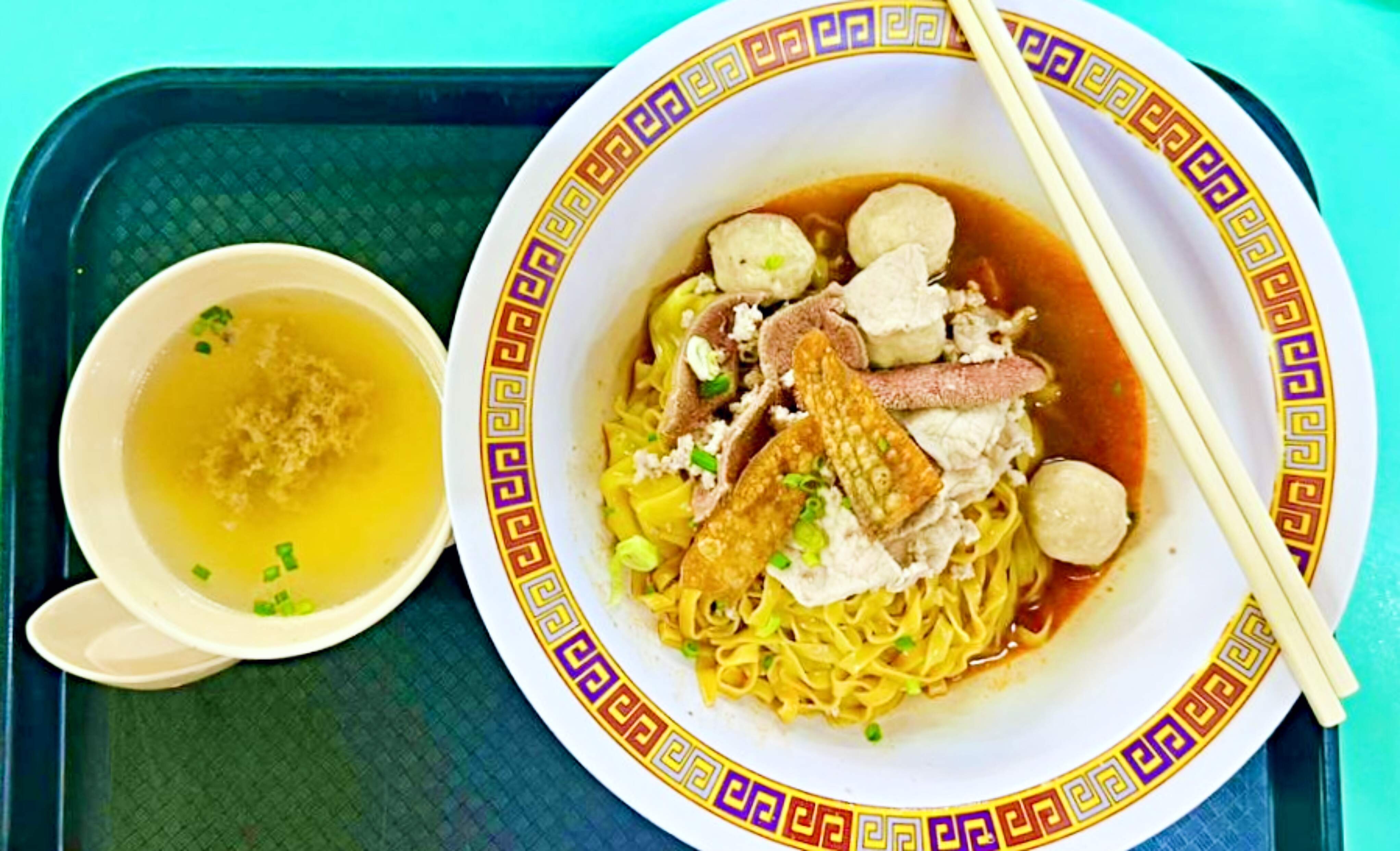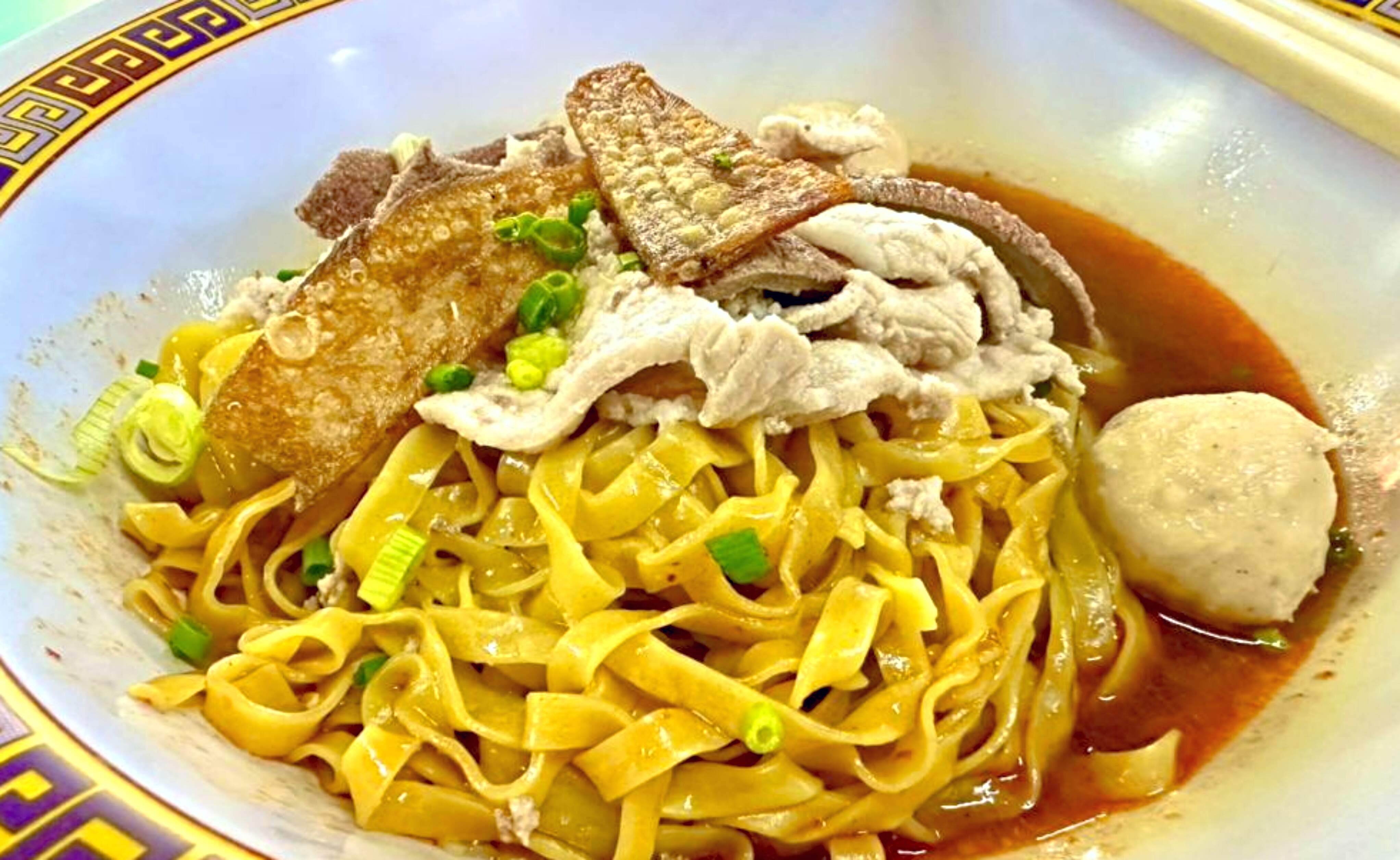 The signature dish - “bak chor mee” is garnished with minced pork, pork balls, wantan dumplings, sliced pork, pig’s liver, golden-fried lardons, and a small piece of crisp-fried flounder chip.