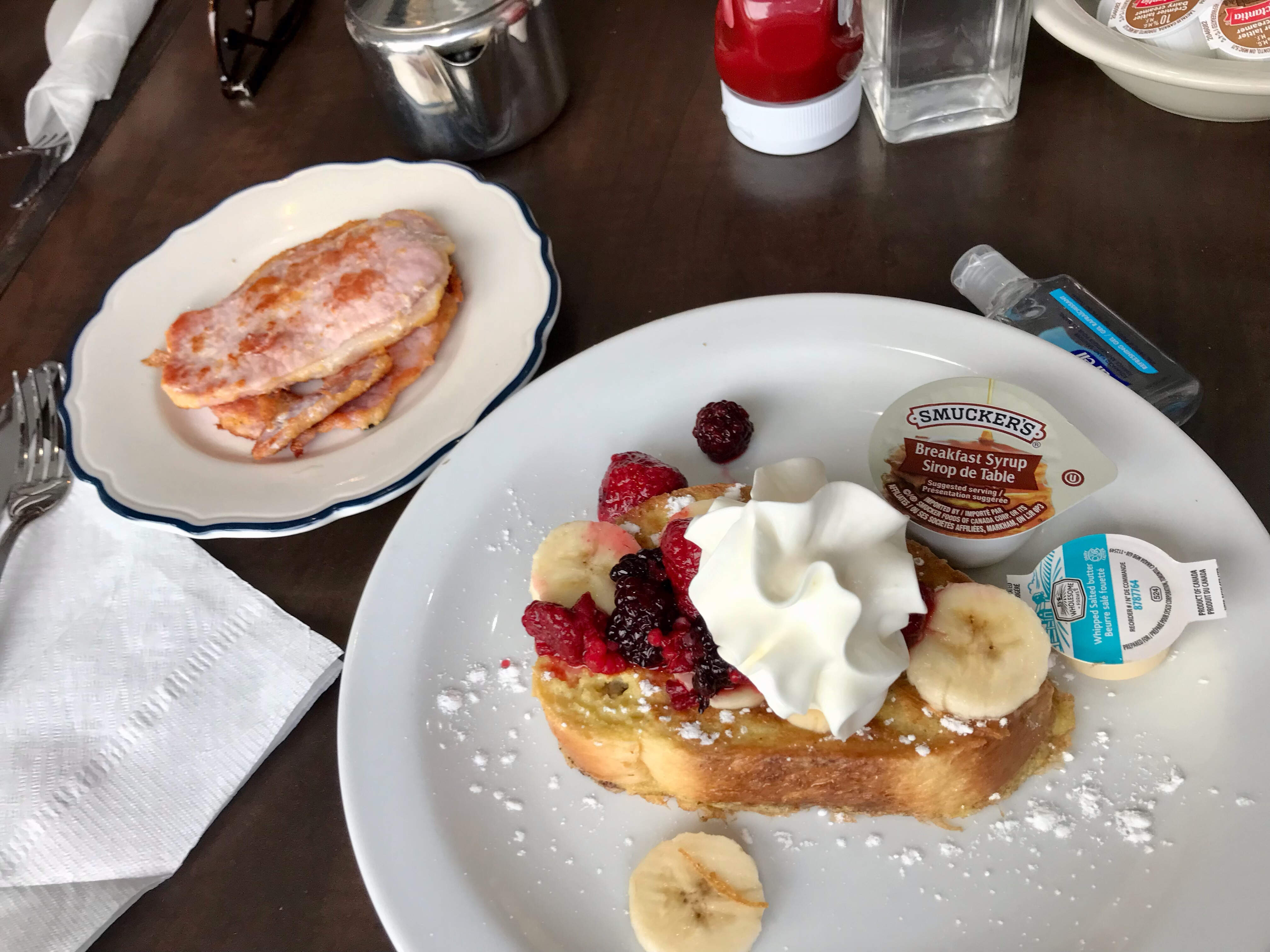 Being near the Quebec border, we tried the Breakfast Poutine - home fries topped with bacon, mozzarella cheese, spring onions, and smothered in Hollandaise sauce, topped with a lightly poached egg. Totally unhealthy and quite satisfying. We also had the Loaded French Toast - thick-sliced bread, egged through and through, with bananas and berries and a side of peameal bacon.