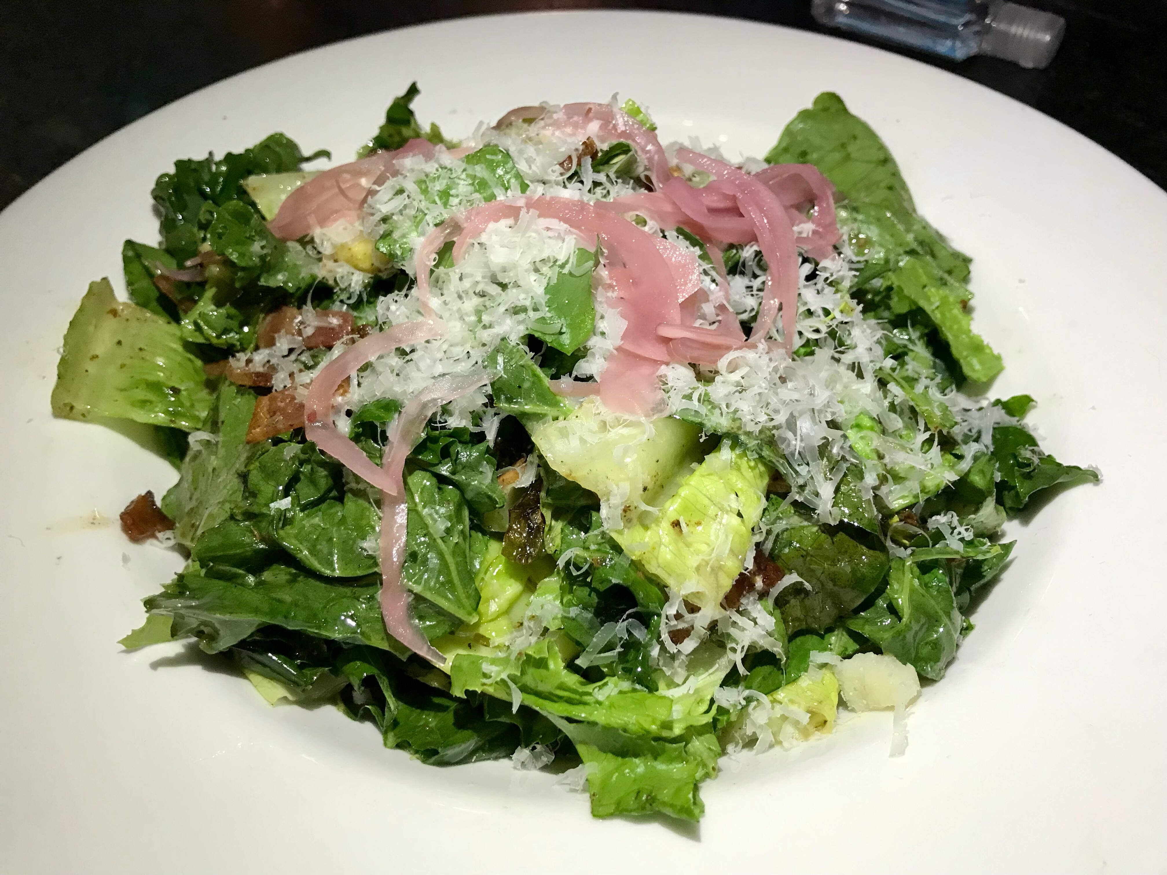 Brussels Salad featured roasted Brussels sprouts, kale, romaine lettuce, bacon, parmesan, pickled onion, and brown butter vinaigrette - tasty, can’t-lose combination of ingredients.