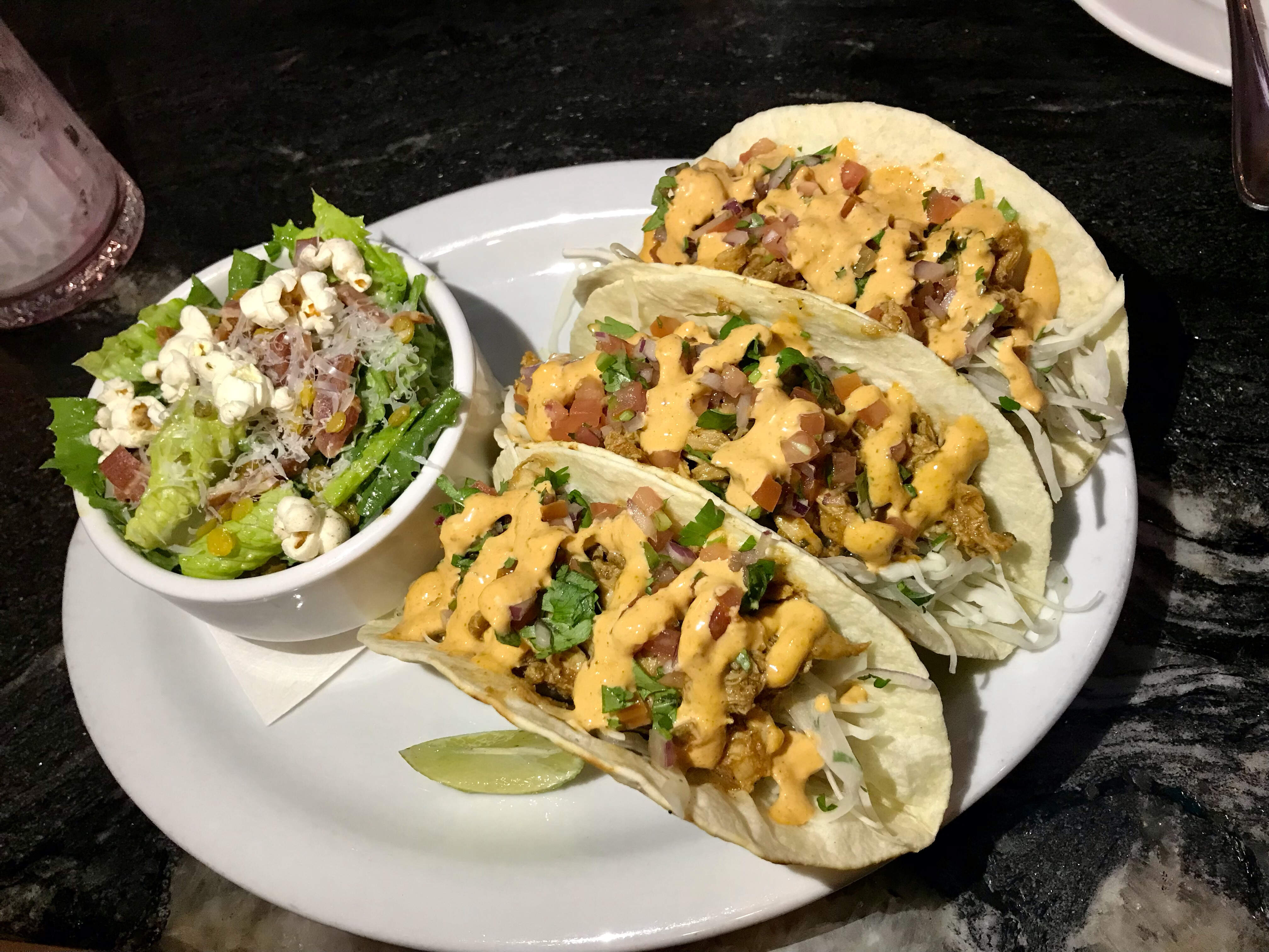 Yucatan Tacos contained marinated and pulled chicken, lots of red onion, cilantro slaw, pico, and Yucatan seasoned mayo - fine, no competition for anything actually Mexican, but enjoyable. It came with a side of The Loon Caesar Salad, with roasted garlic and caper vinaigrette, blackened Caesar dressing, bacon, popcorn, crispy lentil, parmesan - the addition of the popcorn and lentils made this distinctive.