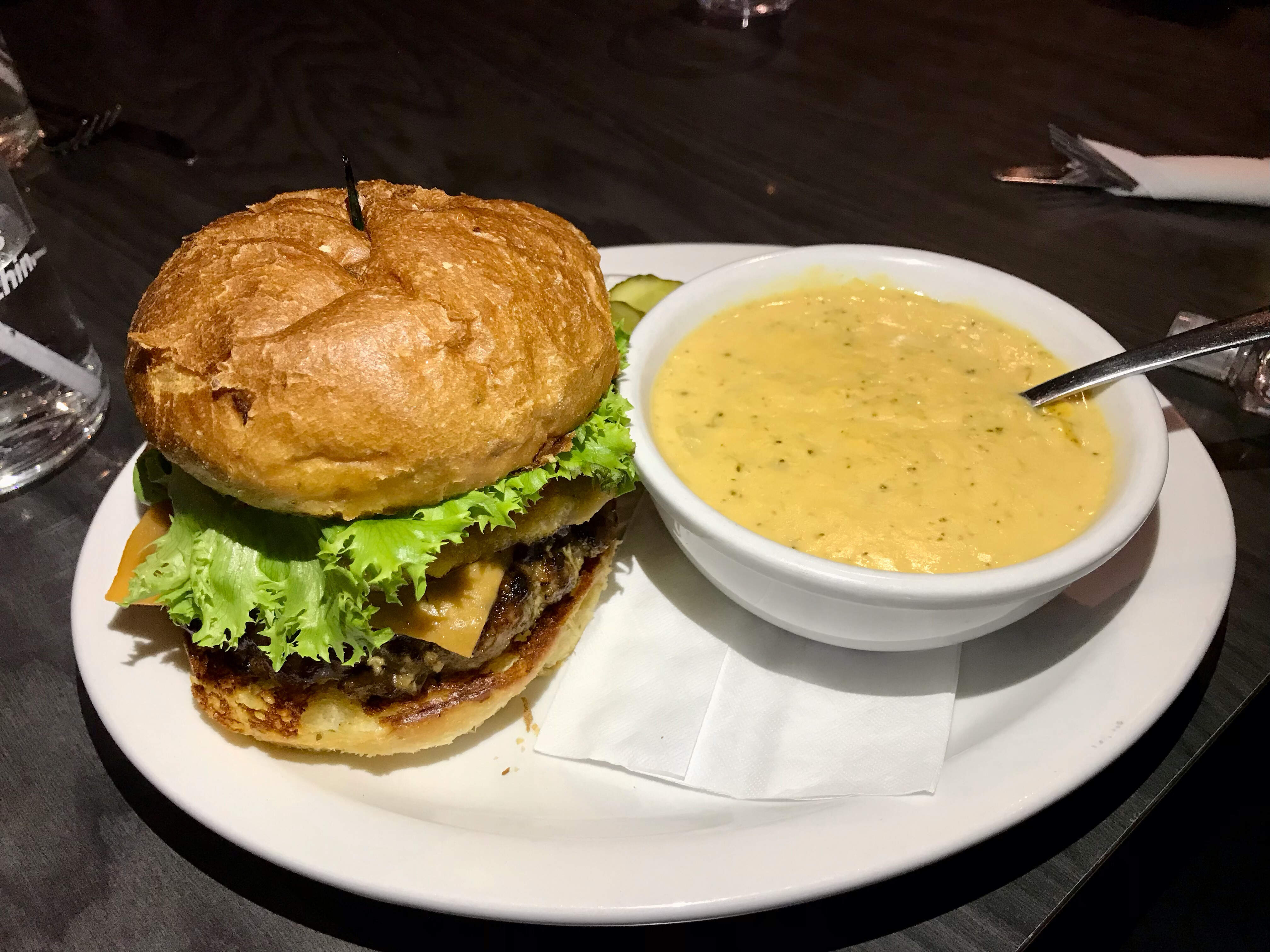Dinner and next day’s breakfast were at Bear’s Den, a comfortable family restaurant in one of the local hotels. I had a Whitewater Farmers Daughter blonde ale, which was pretty good. The pickerel special had a perfectly cooked, lightly breaded filet with mashed potatoes and a few veggies. The Bison Burger had tasty lean meat mixed with onion, topped with white cheddar, peameal bacon, lettuce, tomato, and Forty Creek whiskey BBQ sauce. It came with the soup of the day, which was another take on broccoli and cheddar, this time a lot thicker.