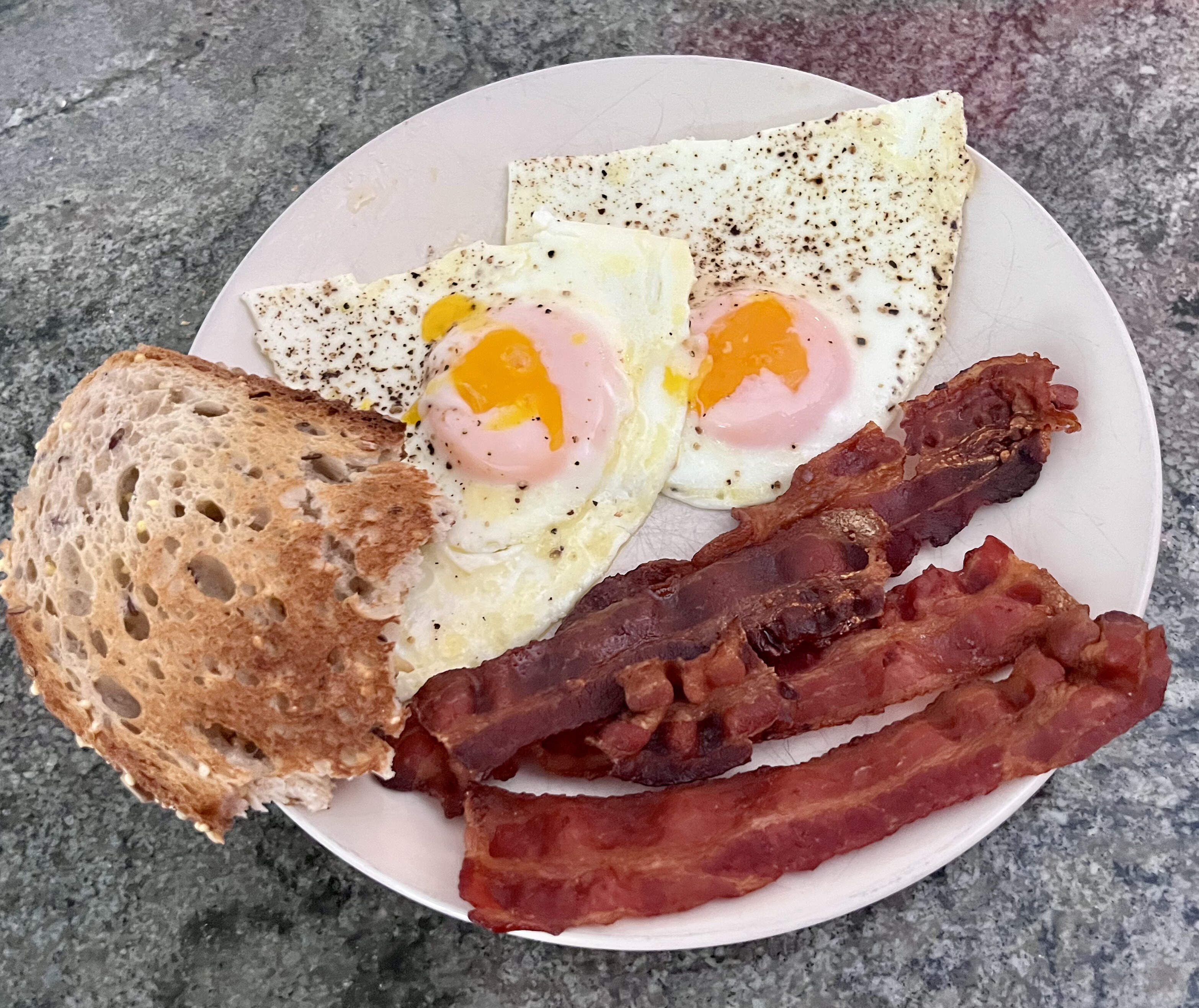 Two dippy eggs, bacon, toast (pic taken before I improved that dry-ass slice with a shmear of Boursin).