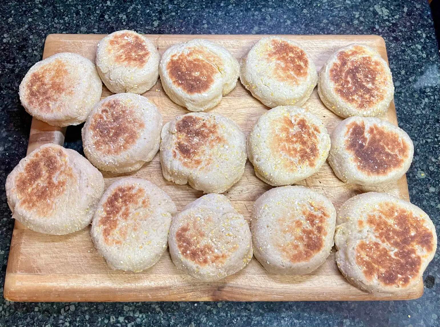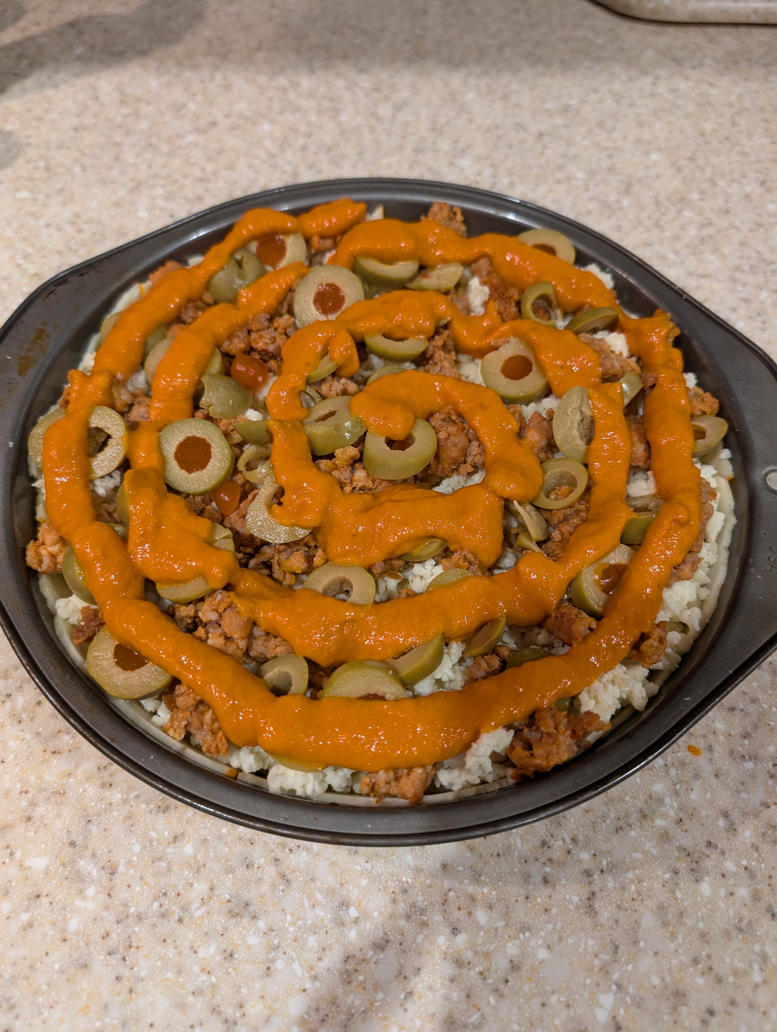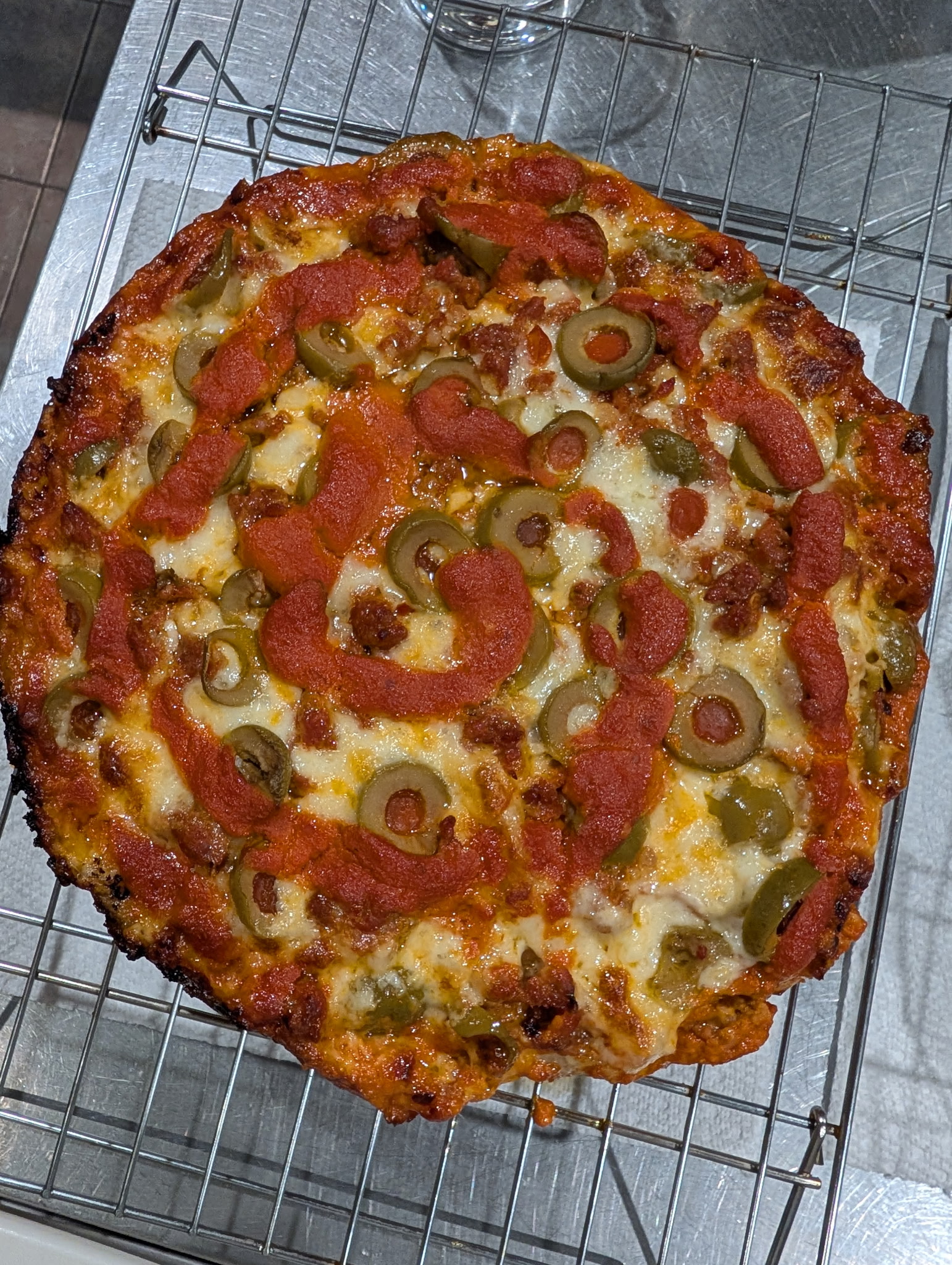 I got in touch with my inner Michigander tonight. Two Detroiters, baked in 9” dark cake pans. Sausage and green olives on one, pepperoni and banana peppers on the other, both with vodka sauce. Crust was KAF bread flour at 77% hydration with 3% salt, overnight ferment. Pre- and post-baking:
