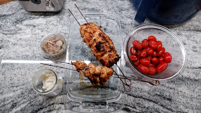 The marinade calls for olive oil, lemon, vinegar,.garlic, salt, Aleppo pepper, parsley, cumin, sumac, white pepper, black pepper and nutmeg.