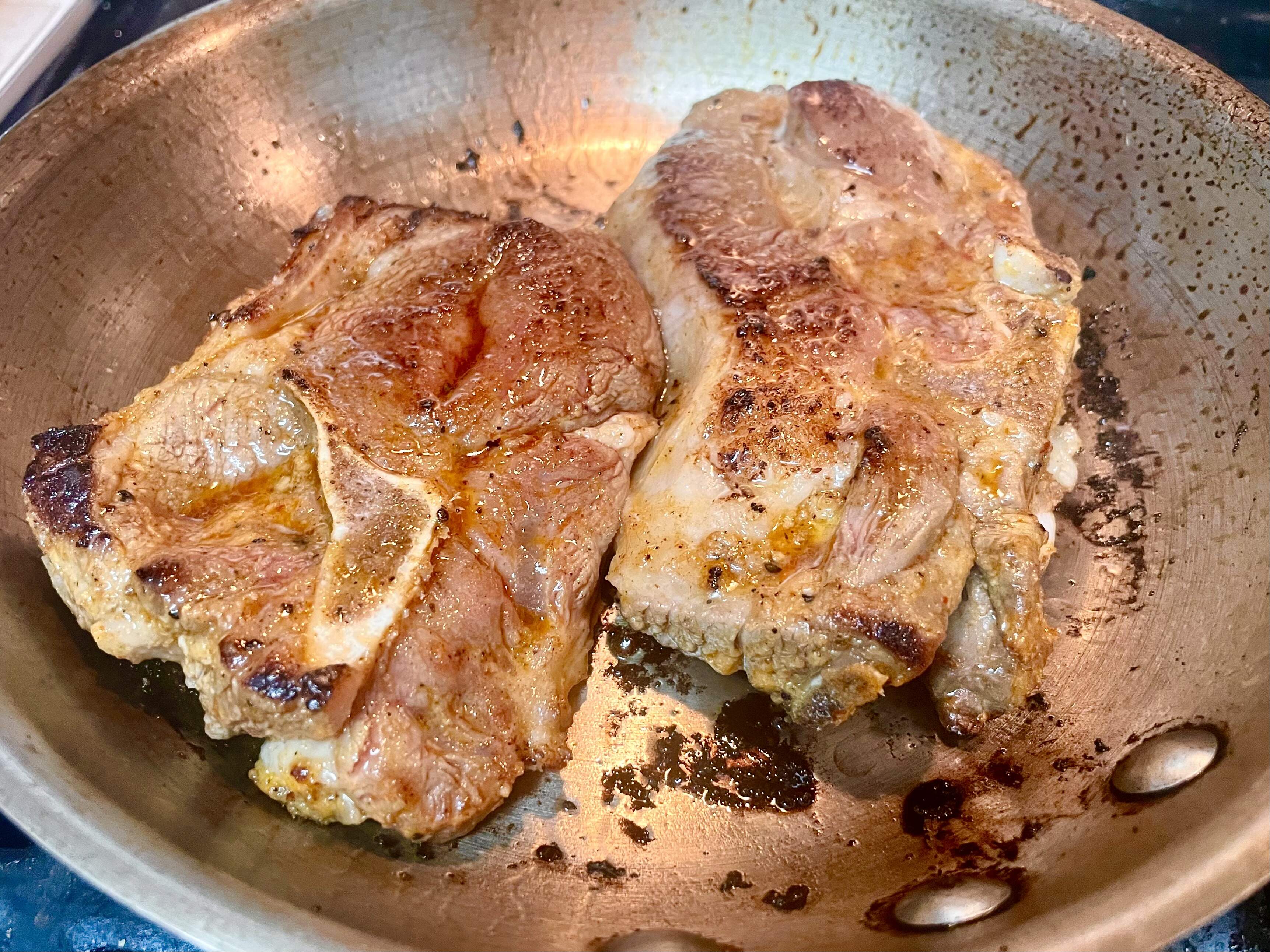 Instead of making the harissa chilli crisp (garlic oil, spices, sesame seeds, and crisp fried onions), I seasoned the lamb chops with harissa, and also topped them with pan juices enhanced with more harissa and butter. I crumbled crisp fried shallots on top (forgot the sesame seeds).