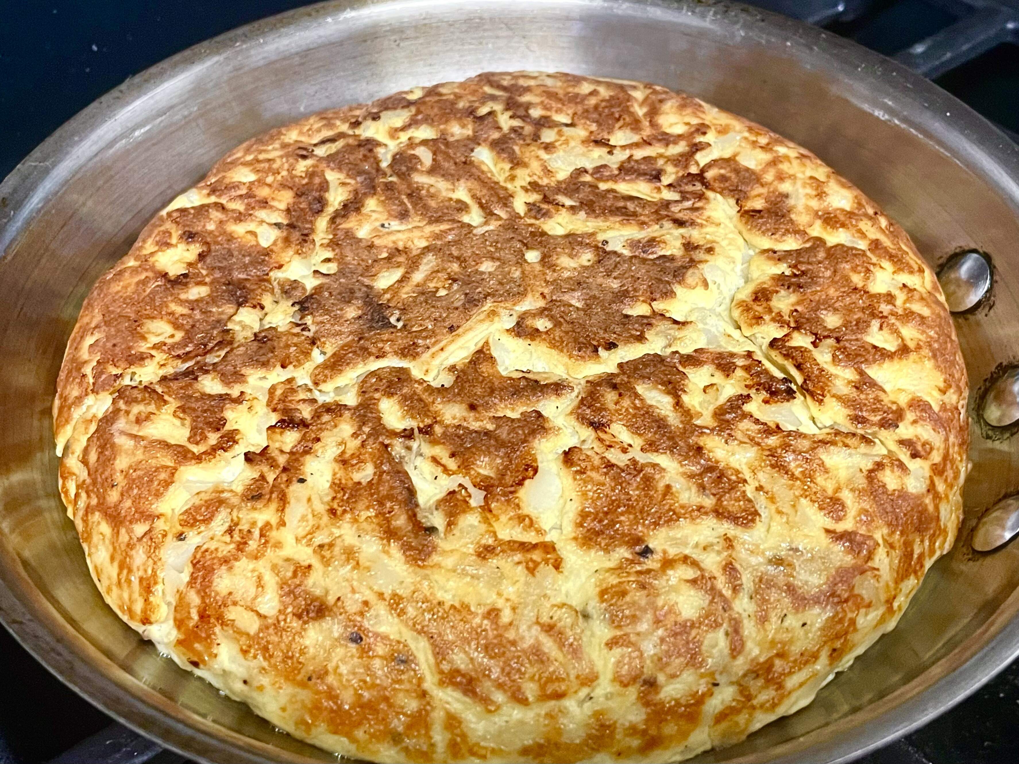 I used frozen grated potatoes instead of dicing or slicing them. I also find it easier to flip the tortilla by sliding the cooked side onto a plate – instead of flipping it onto the plate uncooked side down (much messier). And I like it just set, not runny in the middle (like all my omelettes).